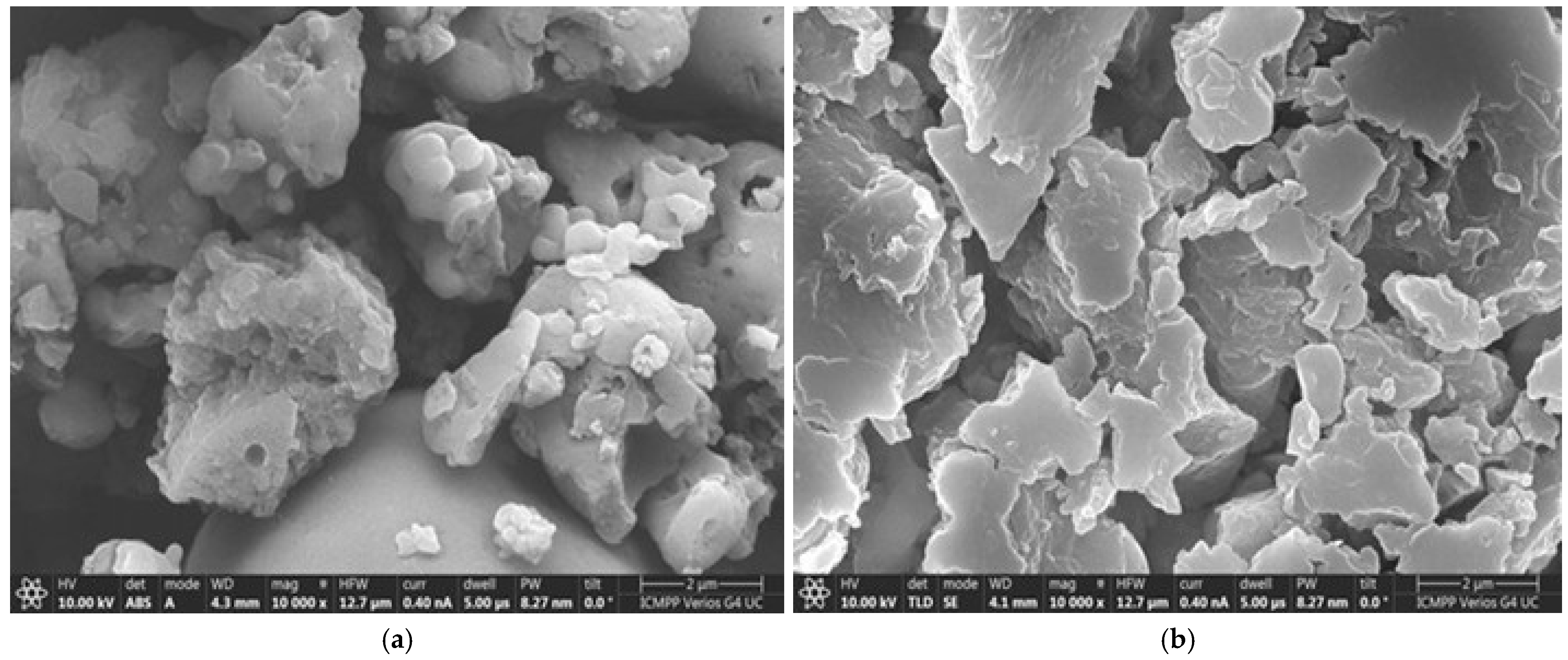 Scanning Electron Microscopy (SEM) analyses, consistently presented across the studies [19,20,21,22,23], provide visual confirmation of the lignin’s morphology. Representative SEM micrographs (Figure 3) reveal particles that are somewhat irregular in shape and tend to form micrometer-sized agglomerates.