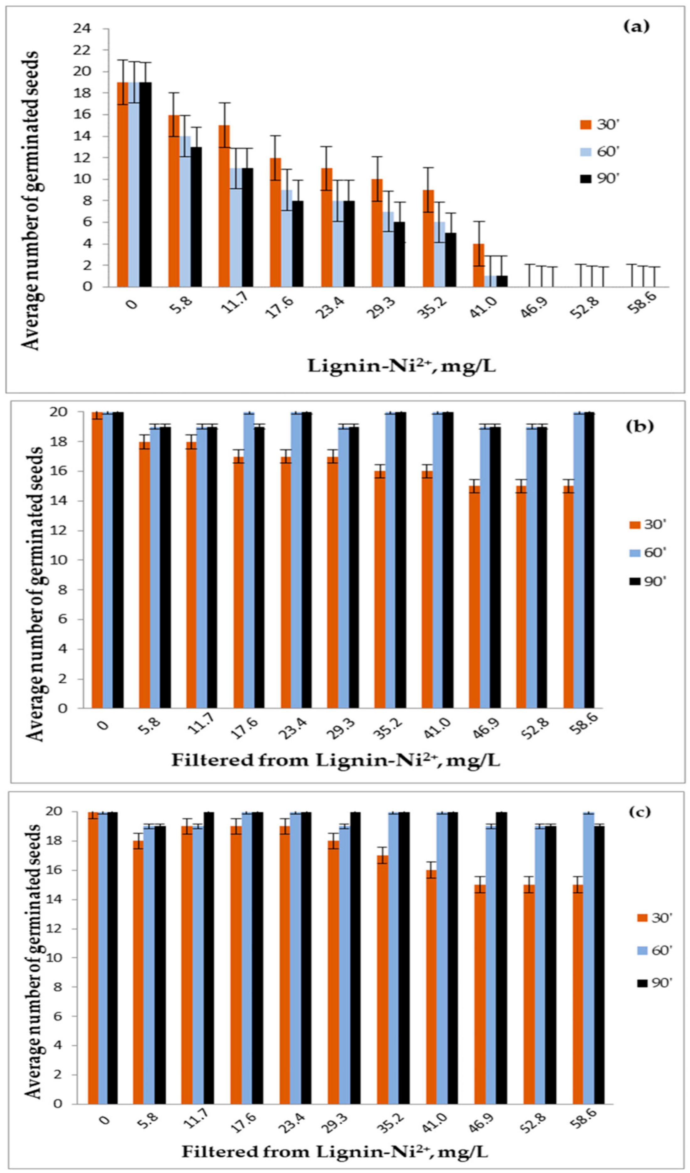 The residual concentration of the metal ion in the filtrate was determined using appropriate analytical methods to assess the amount adsorbed by the lignin (Table 4).