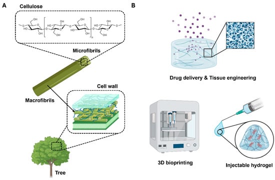 In recent years, attempts to utilize natural polymers for biomedical applications, including drug delivery, wound dressings, and tissue engineering scaffolds, have notably increased [1,2]. Scientists and industrialists foresee that such attempts could yield environmentally friendly products that are renewable and sustainable. Among various natural polymers, cellulose has garnered significant attention in the biomedical field owing to its biocompatibility, structural tunability, and natural abundance, rendering it ideal for applications such as drug delivery, wound dressing, and tissue engineering (Figure 1A).