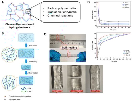 Preparation of CNF hydrogels via chemical crosslinking. (A) Exemplary interactions that yield chemically crosslinked hydrogel networks (created using Biorender.com). (B) Schematic representation of chemically conjugated network within PVA/CNF hydrogel upon γ-irradiation. (Reproduced/Adapted with permission from [35], MDPI, 2024). (C) Self-healing features of a CNF/PVA hydrogel demonstrated by observing full healing after being cut in half (Reproduced/Adapted with permission from [36], American Chemical Society, 2024). (D) Difference in deswelling (top) and swelling kinetics (bottom) of PNIPAm-CNF hydrogel due to changes in CNF content (0, 2.5, 5, 10%). (Reproduced/Adapted with permission from [37], Elsevier, 2016).