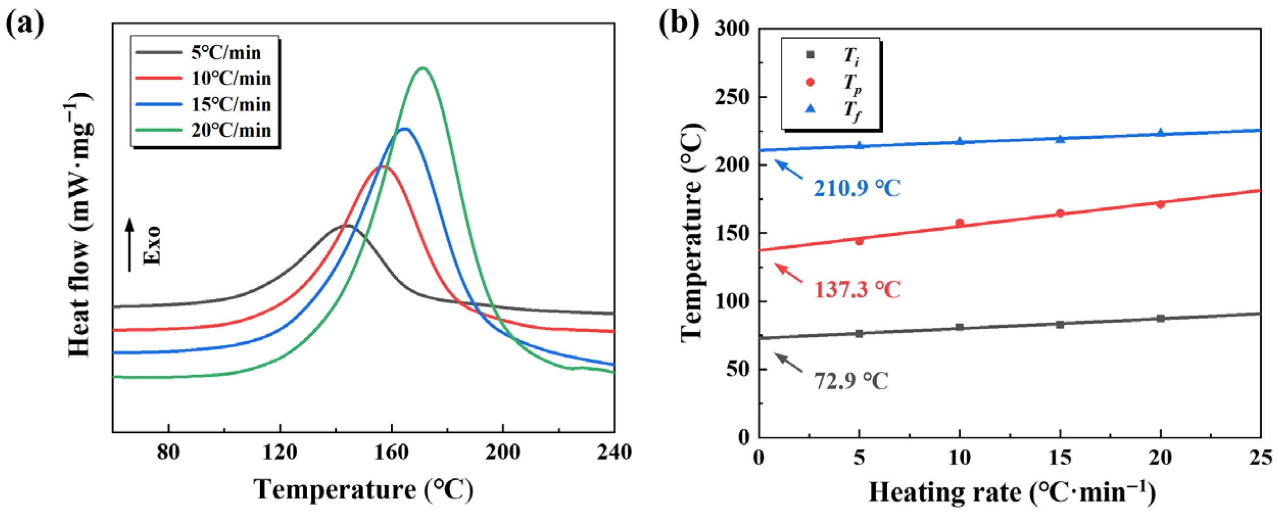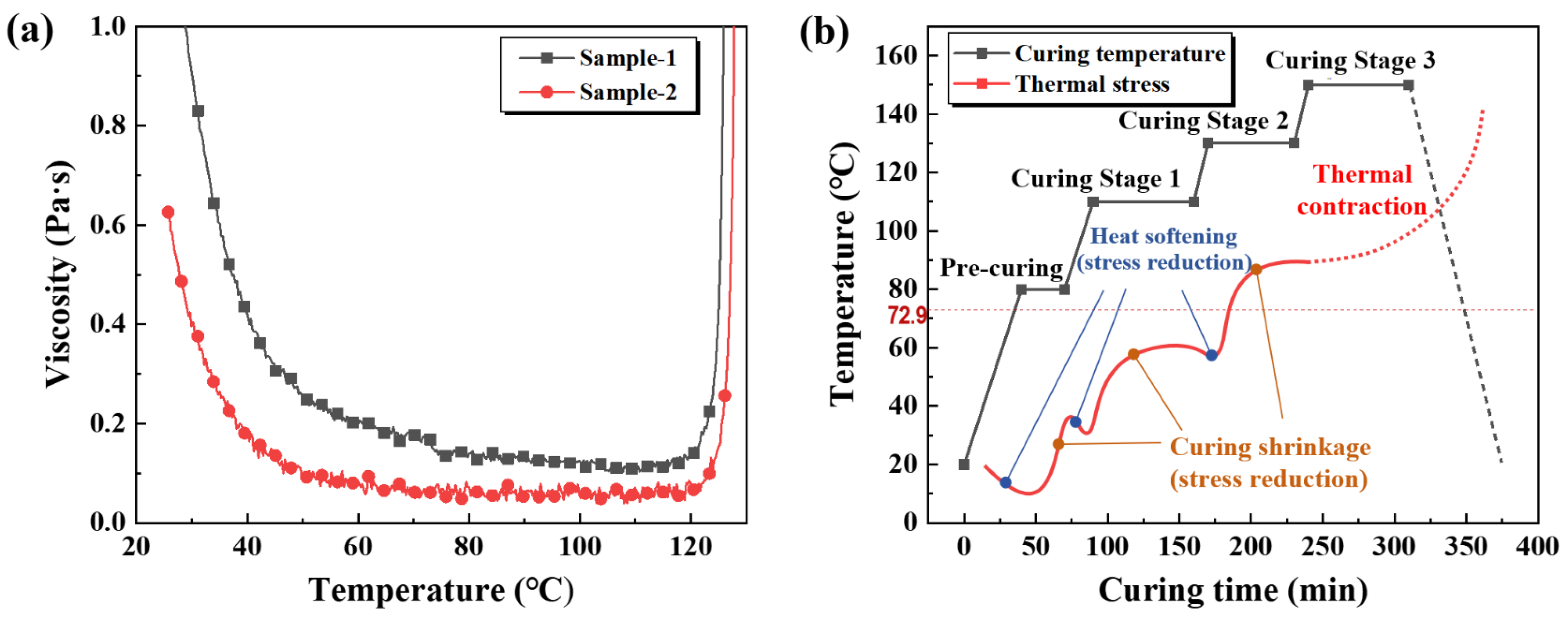 - The modified resin system exhibits a viscosity of approximately 800 mPa·s at ambient temperature, with curing onset and completion temperatures of 72.9 °C and 210.9 °C, respectively. These characteristics ensure favorable processability and thermosetting behavior, satisfying the requirements for wet-filament winding. Based on its rheological and curing profiles, a three-stage curing schedule, encompassing pre-curing, primary curing, and post-curing phases, was developed to ensure complete crosslinking and structural stability during molding.