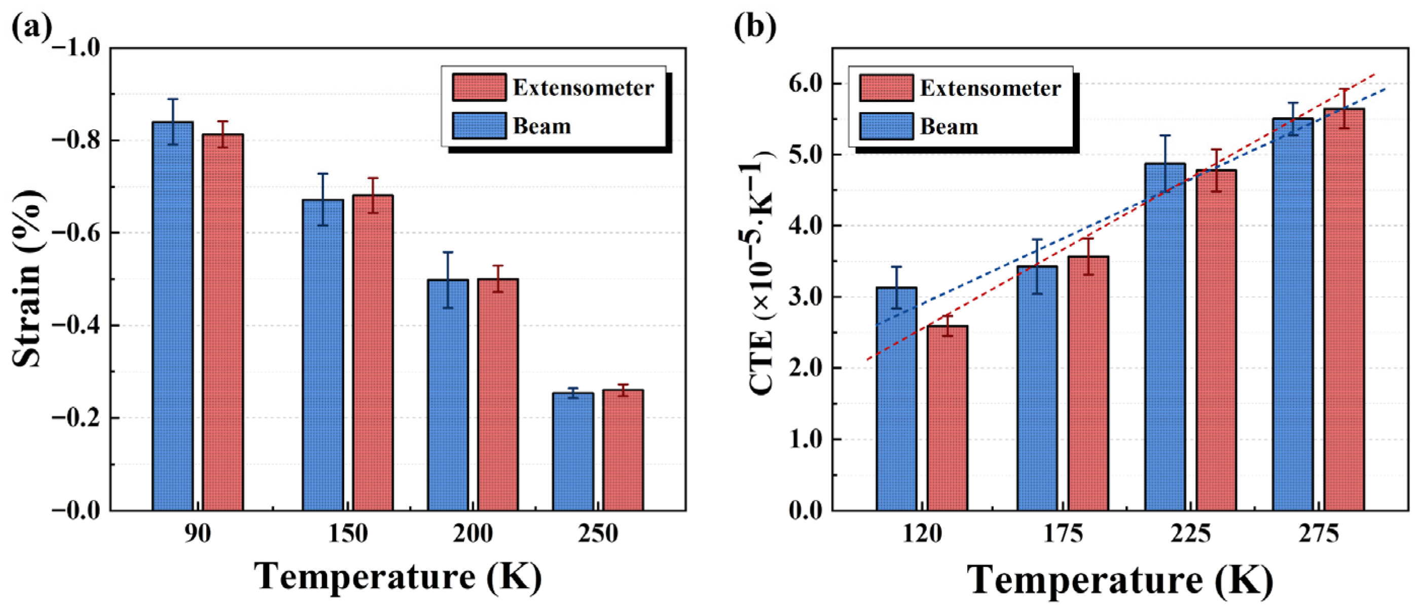 Temperature /K | CTE by Extensometer /K−1 | CV | CTE by Crosshead Displacement/K−1 | CV | Average /K−1 |