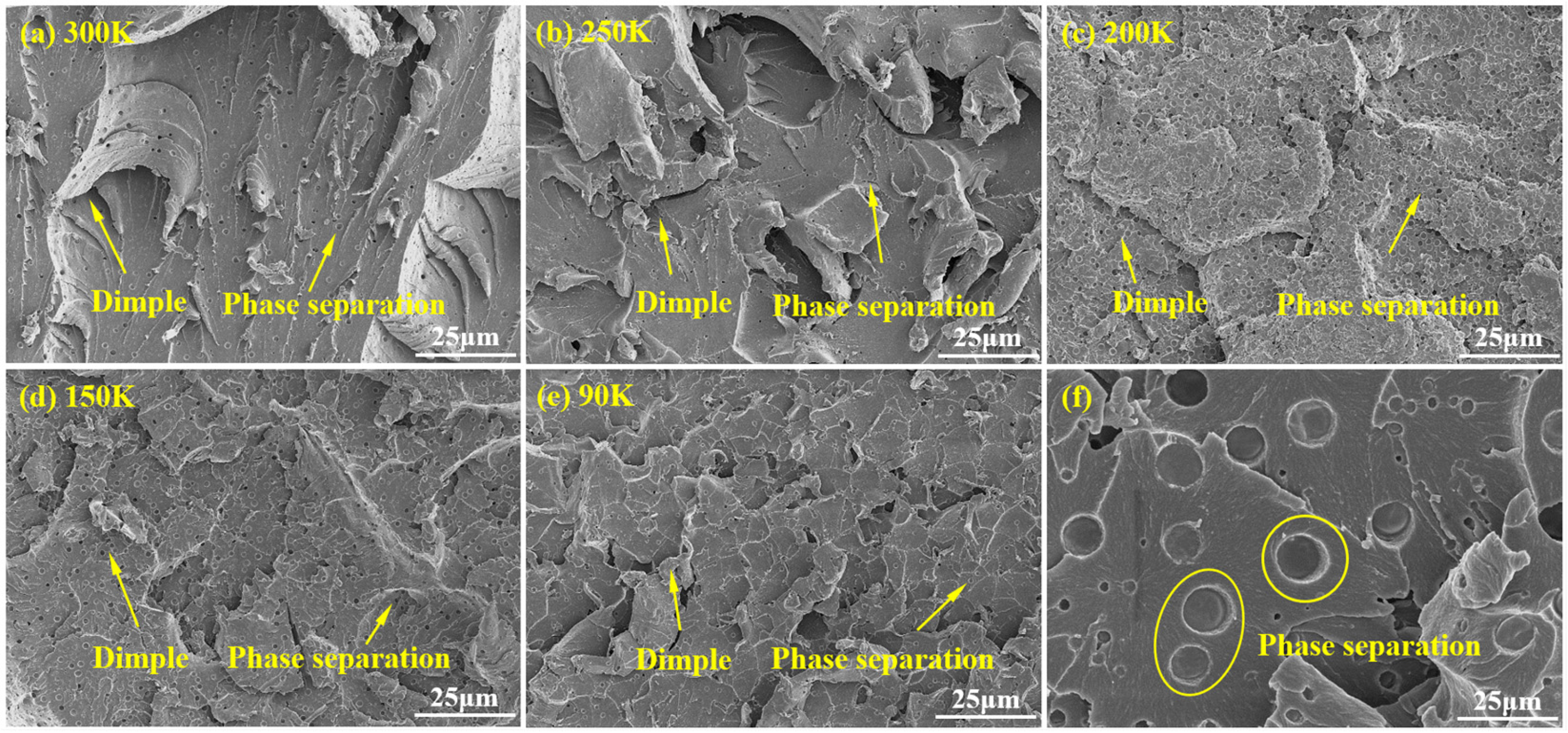 - The tensile strength and elastic modulus of the modified resin system increase linearly as the temperature decreases. At 90 K, these properties are enhanced by approximately 77% and 180%, respectively, compared with their values at 300 K. This strengthening is primarily attributed to the restricted mobility of molecular chains and the reduction in free volume at low temperature, which together increase the stiffness of the resin network. Nevertheless, SEM observations of fracture surfaces reveal that the resin retains a measurable degree of plastic deformability even under cryogenic conditions. This is evidenced by the presence of ductile fracture features, including dimples, crack deflection, particle pull-out, and interfacial debonding. Furthermore, small phase-separated domains formed during the modification process serve as crack-pinning sites, diverting crack propagation paths and promoting energy absorption during fracture. These combined microstructural mechanisms account for the concurrent low-temperature strengthening and partial retention of plasticity in the modified resin.