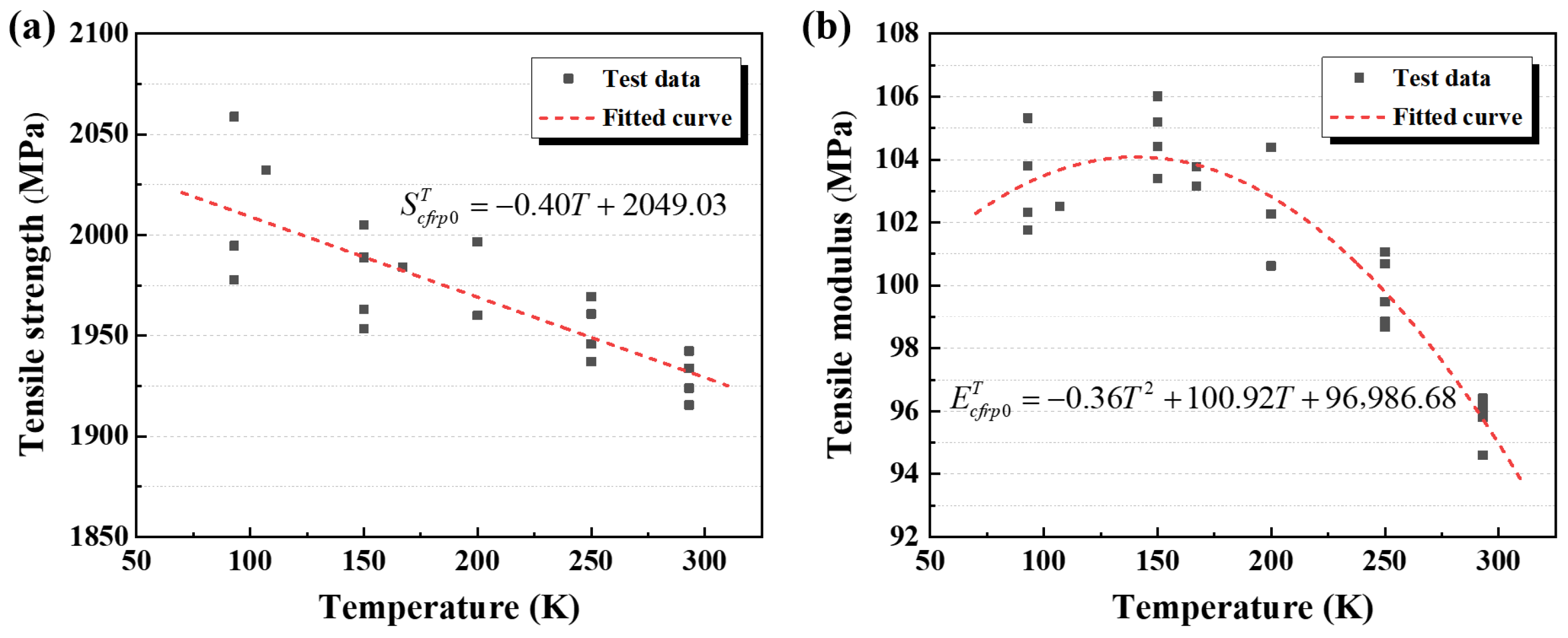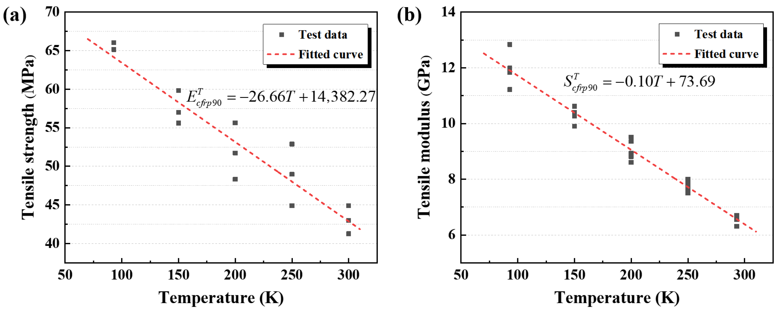 - CFRP-0° specimens exhibit a fibre breakage-dominated failure mode, with minimal variations in tensile strength and elastic modulus across temperatures. At 90 K, the tensile strength and elastic modulus increase by approximately 4.3% and 7.7%, respectively, compared with their 300 K values. The elastic modulus shows a non-monotonic trend—rising initially and then slightly decreasing—whereas the tensile strength follows an approximately linear increase with decreasing temperature. CFRP-90° specimens, in contrast, exhibit a failure mode governed by both matrix cracking and fibre–matrix interfacial debonding. Their mechanical properties are highly temperature-sensitive: at 90 K, the tensile strength and transverse modulus increase by approximately 52.2% and 82.4%, respectively, relative to 300 K, with both properties demonstrating a linear upward trend as the temperature decreases.