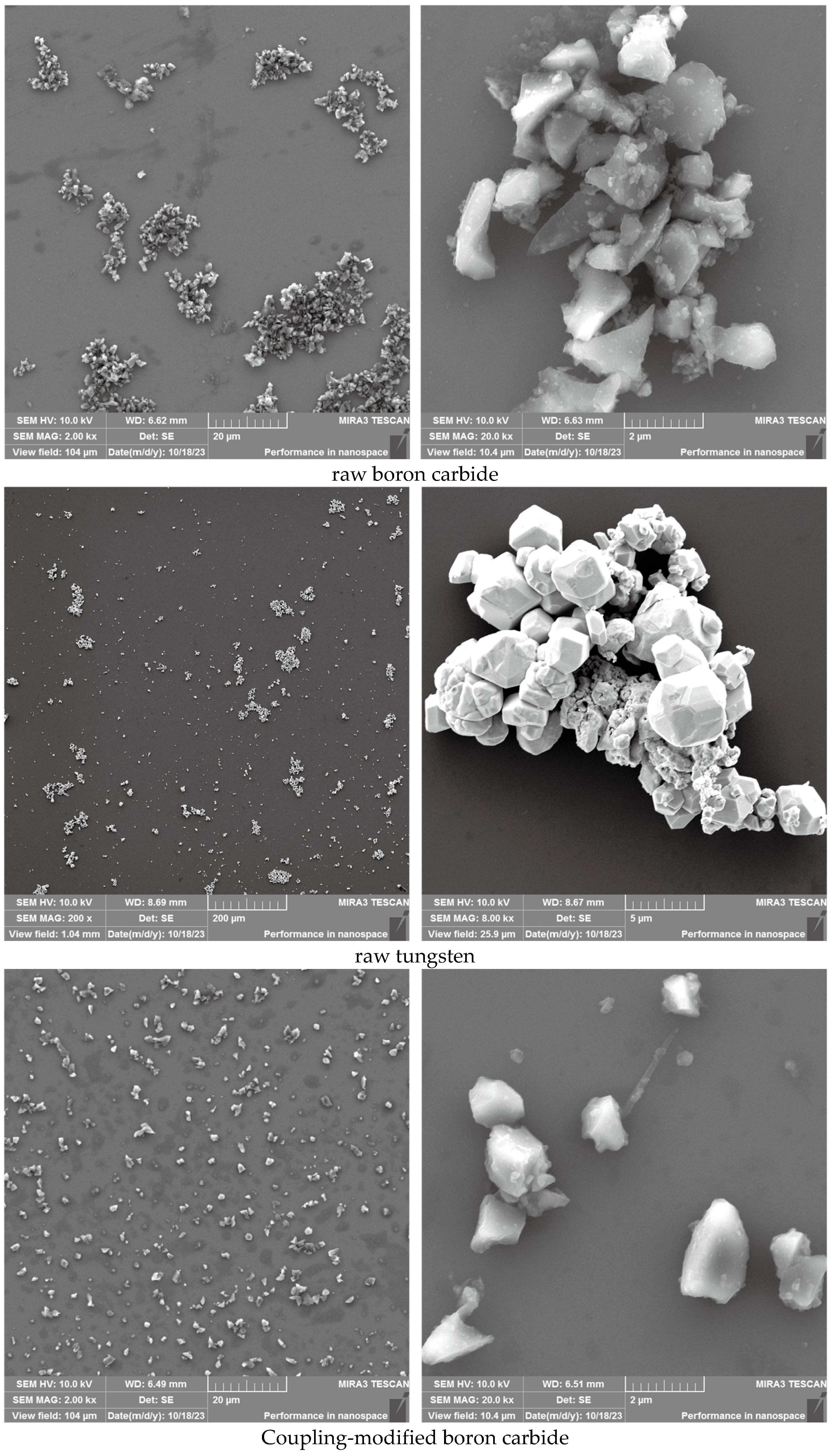tungsten content | 0 | 1.35%B4C | 2%W + 1.35%B4C | 20%W + 1.35%B4C | 30%W + 1.35%B4C | 40%W + 1.35%B4C | 48.65%W + 1.35%B4C | Filler modified |