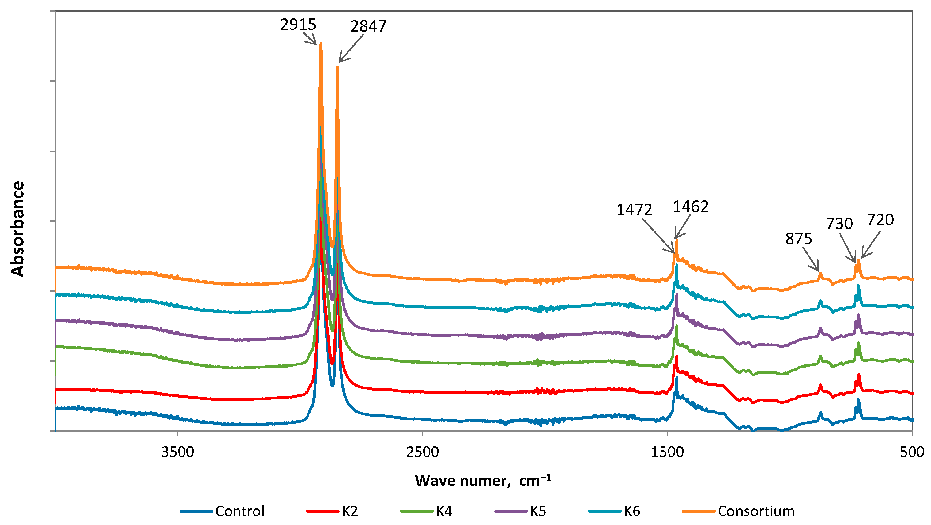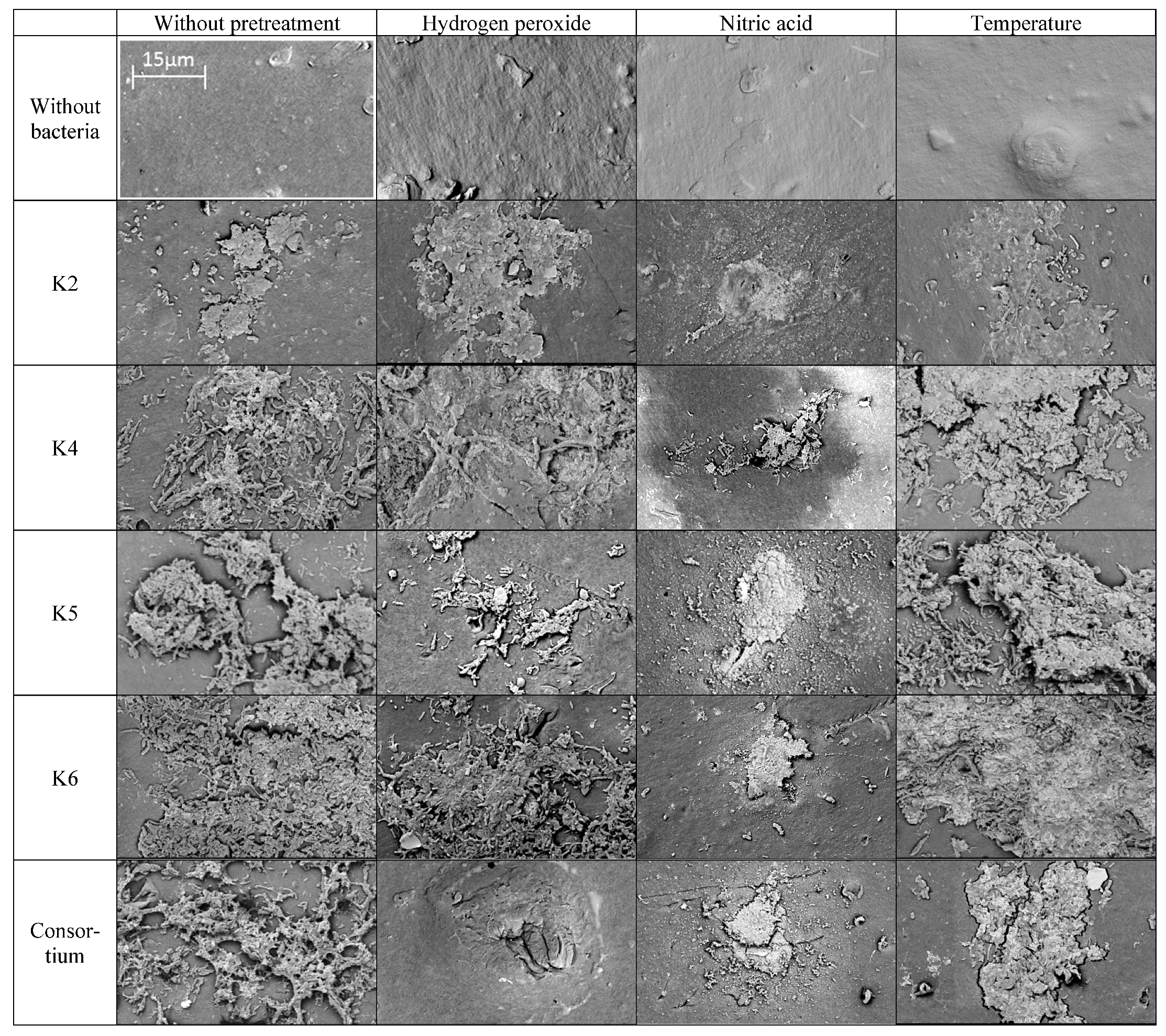 | Consortium | Untreated LDPE | LDPE(H2O2) | LDPE(HNO3) | LDPE(T) |