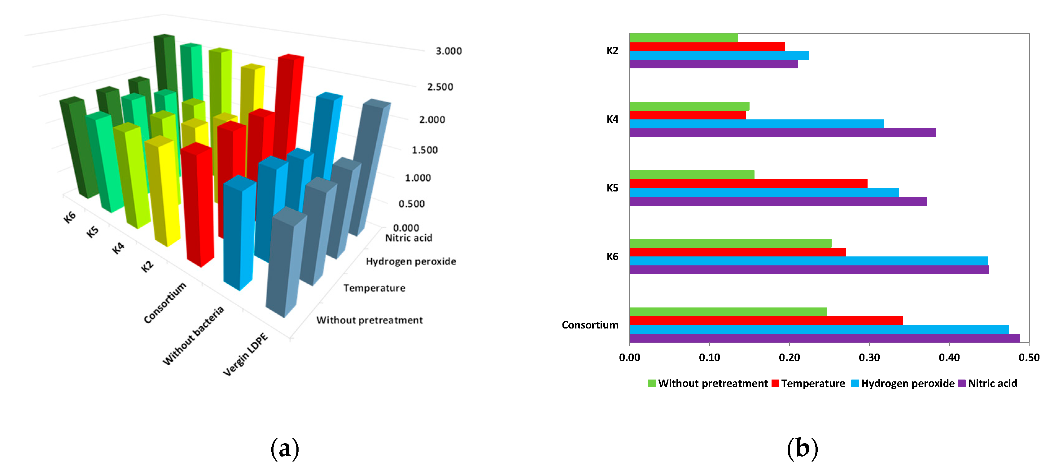 - Szczyrba, E.; Pokynbroda, T.; Koretska, N.; Gąszczak, A. Isolation and characterization of new bacterial strains degrading low-density polyethylene. Chem. Process. Eng. New Front. 2024, 45, e60. [Google Scholar] [CrossRef]
