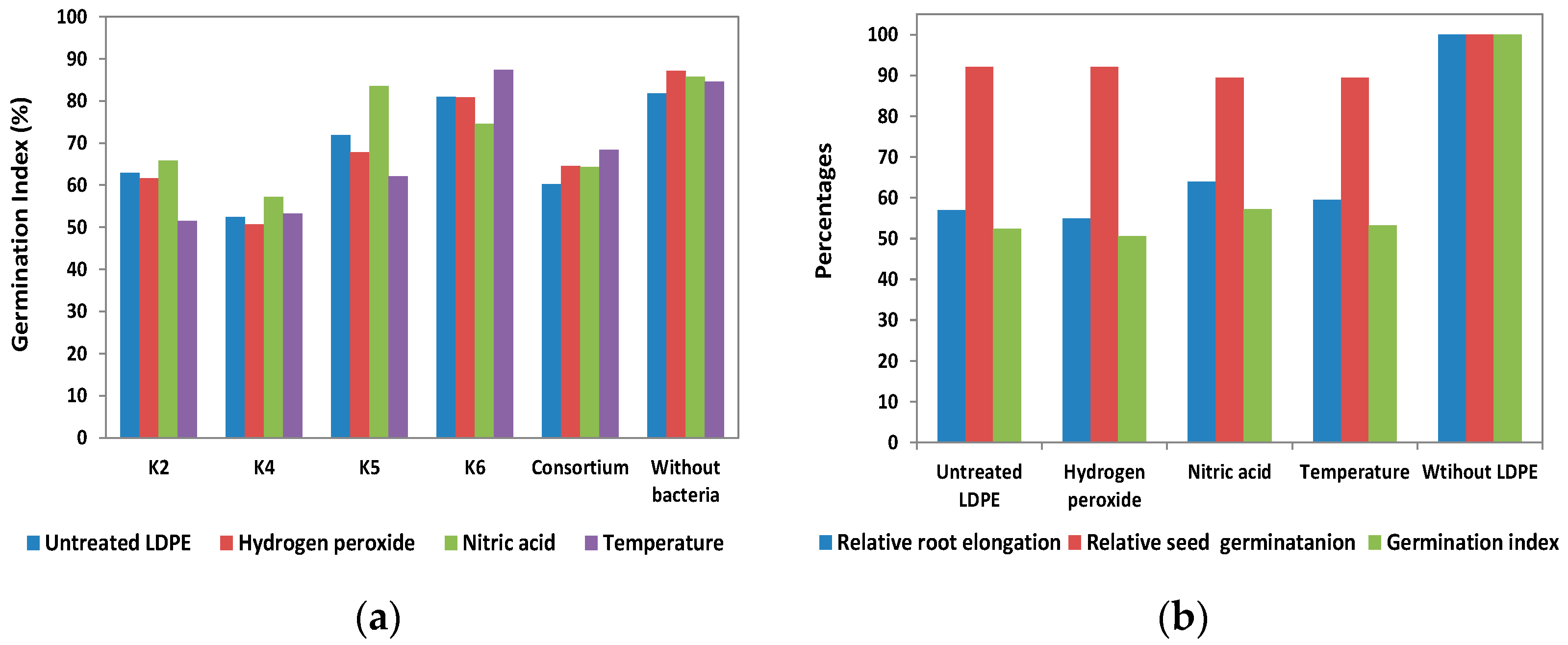 - Mazaheri, H.; Nazeri, S. Biodegradation and Detoxification of Low-Density Polyethylene (LDPE) by Stenotrophomonas sp. and Alcaligenaceae bacterium. Bull. Environ. Contam. Toxicol. 2024, 112, 19. [Google Scholar] [CrossRef] [PubMed]