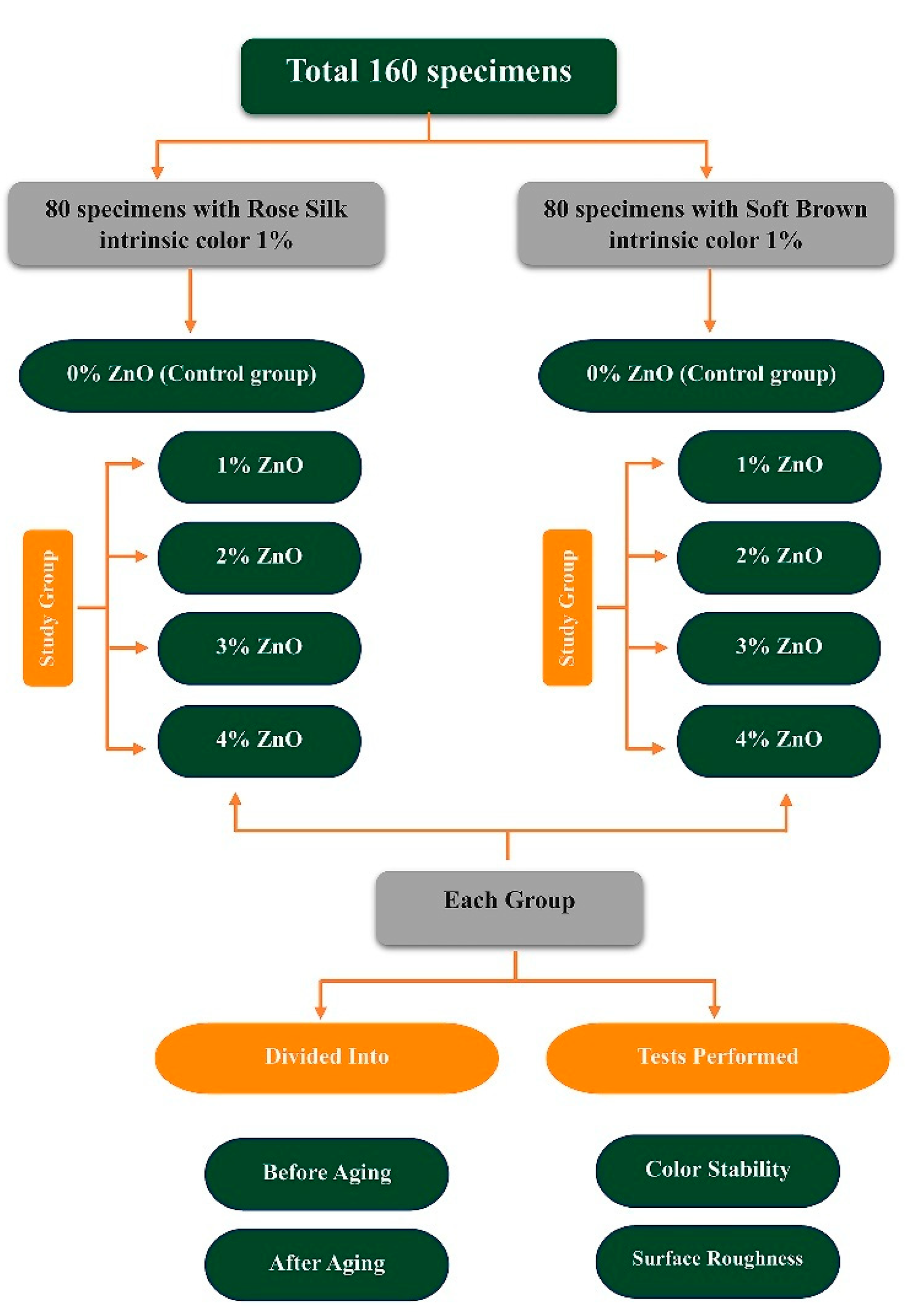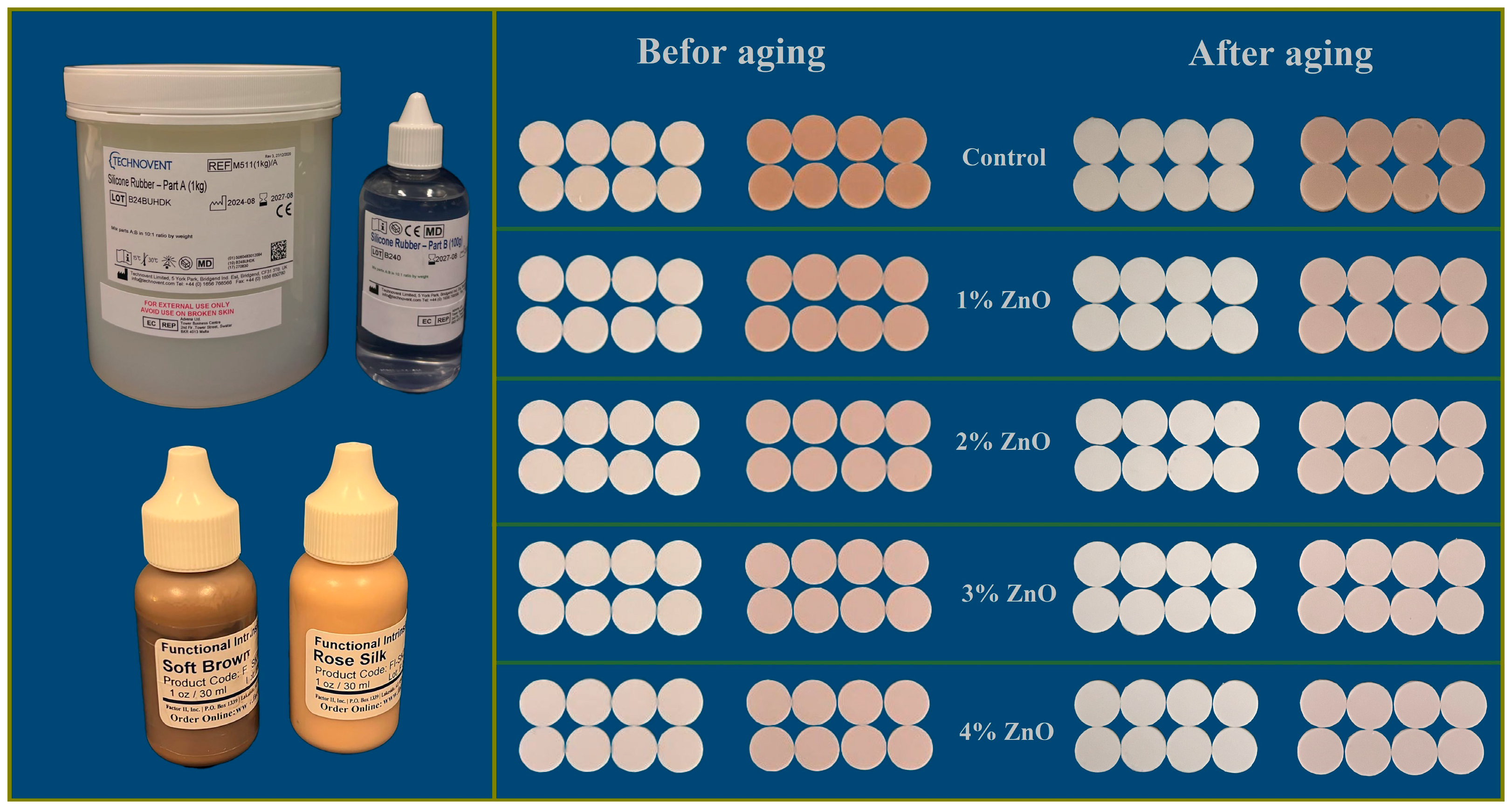 - Charoenkijkajorn, D.; Sanohkan, S. The Effect of Nano Zinc Oxide Particles on Color Stability of MDX4-4210 Silicone Prostheses. Eur. J. Dent. 2020, 14, 525–532. [Google Scholar] [CrossRef]