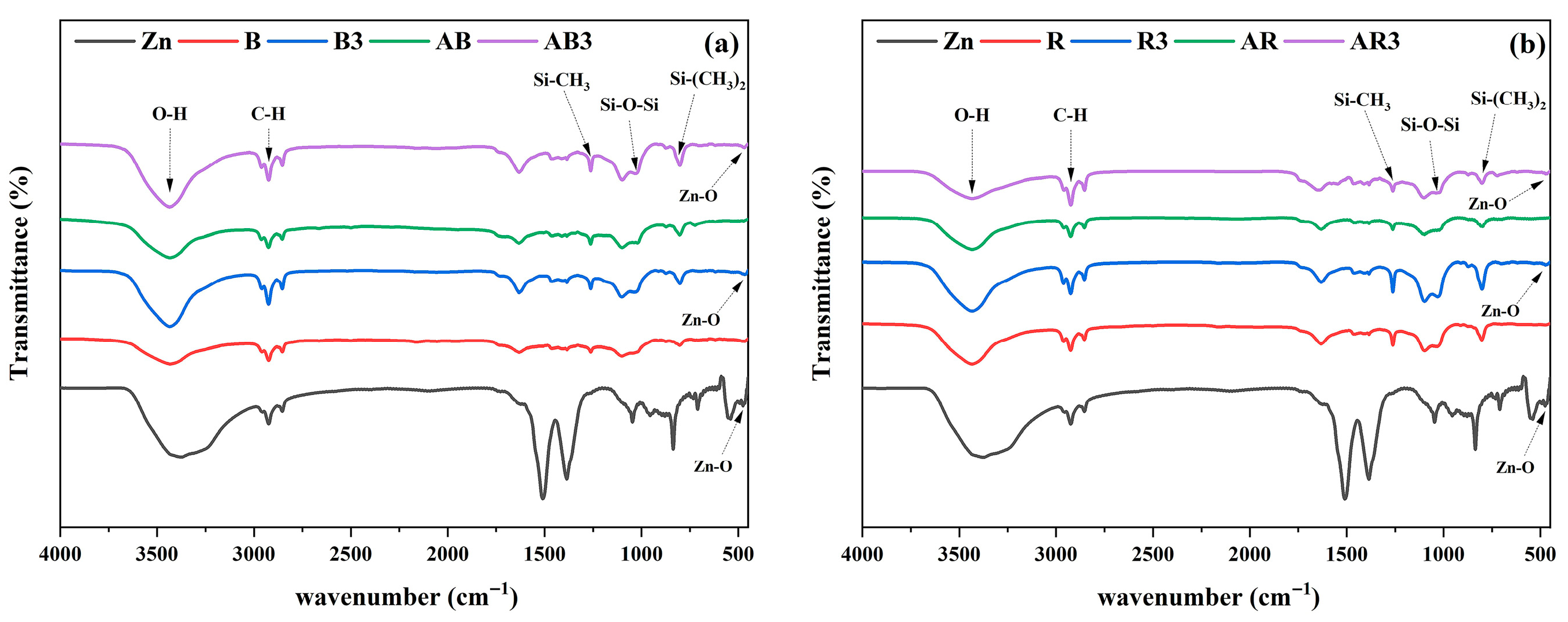 - Cao, Z.; Zhang, Z.; Wang, F.; Wang, G. Synthesis and UV shielding properties of zinc oxide ultrafine particles modified with silica and trimethyl siloxane. Colloids Surf. A Physicochem. Eng. Asp. 2009, 340, 161–167. [Google Scholar] [CrossRef]