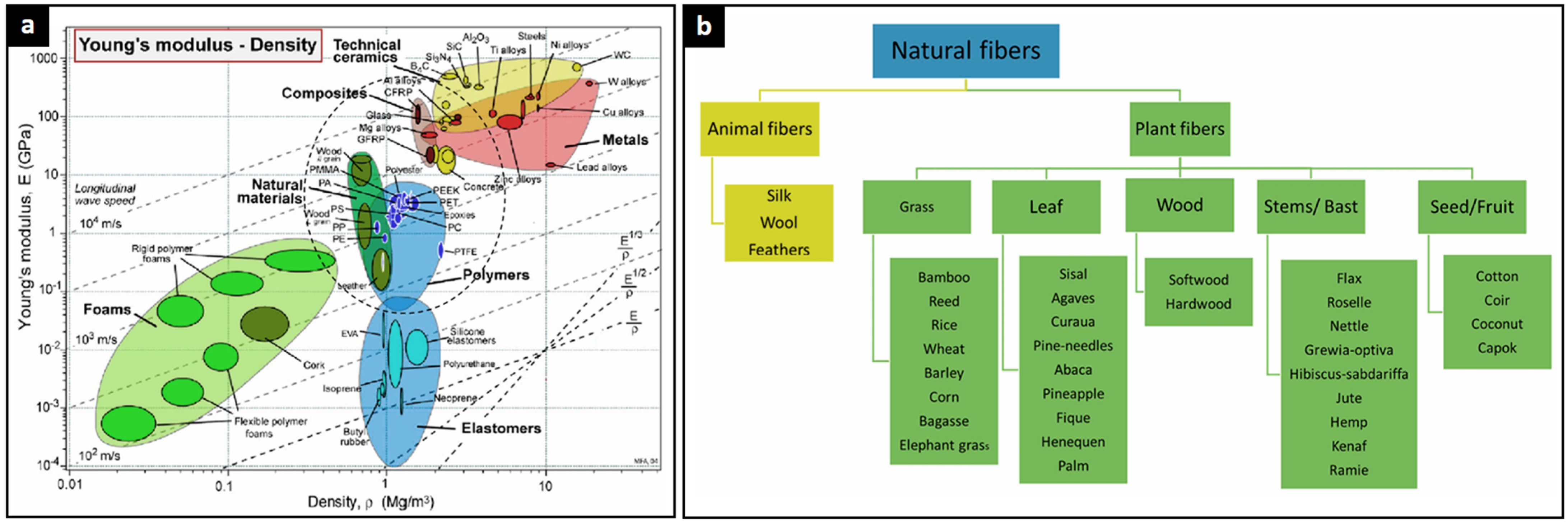 | Natural Fibers (Flax, Hemp) | 500–1500 | 50–70 | 1.5 | Low cost, low density, biodegradable, good damping | Low mechanical properties, high moisture absorption, property variability |