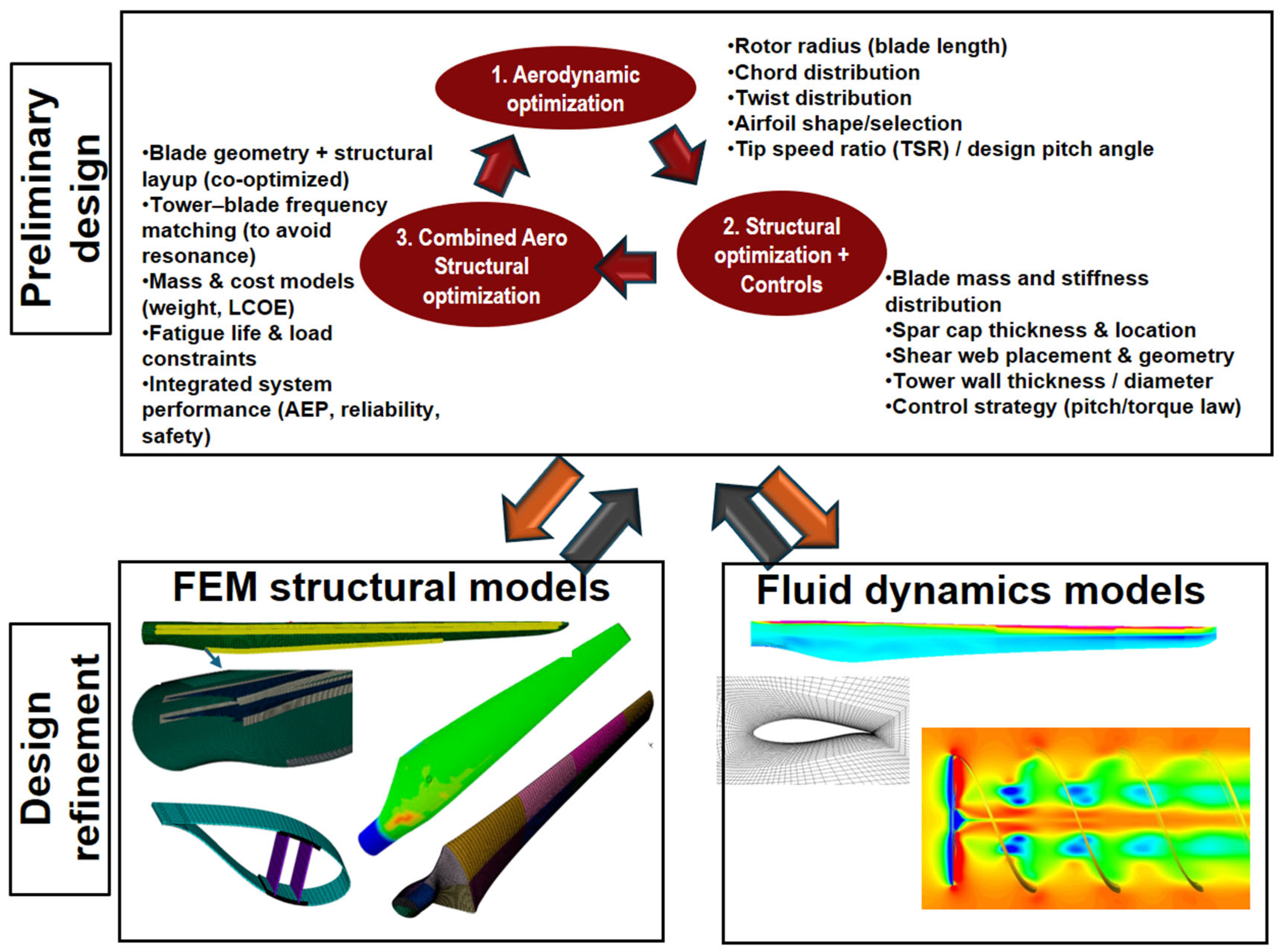 - The optimization of wind turbines is no longer a sequential process. Integrated MDO frameworks that combine aerodynamics, structural mechanics, and control systems are now standard, enabling the design of lighter, more efficient, and more reliable systems.
