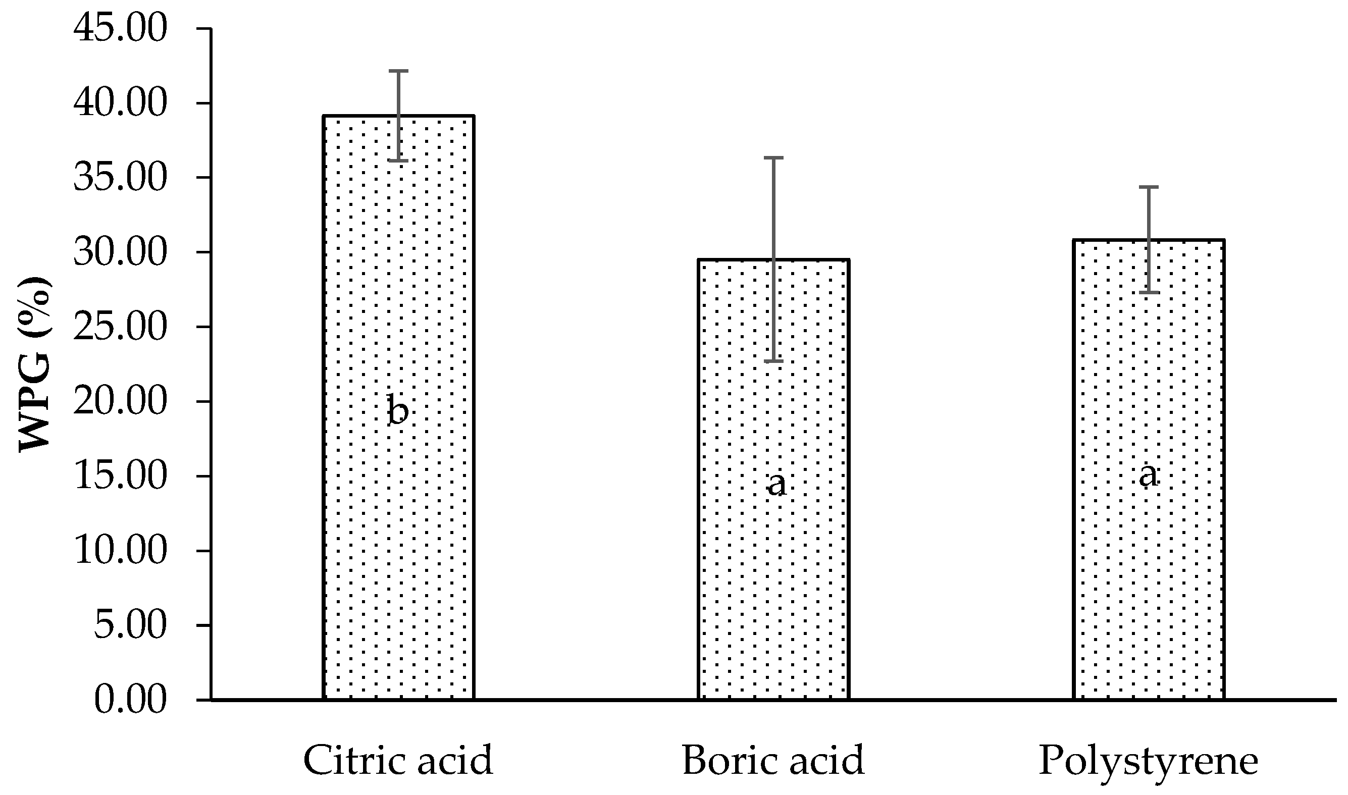 - Fidan, M.S.; Adanur, H. Physical and Mechanical Properties of Wood Impregnated with Quebracho and Boron Compounds. Forestist 2019, 69, 68–80. [Google Scholar] [CrossRef]