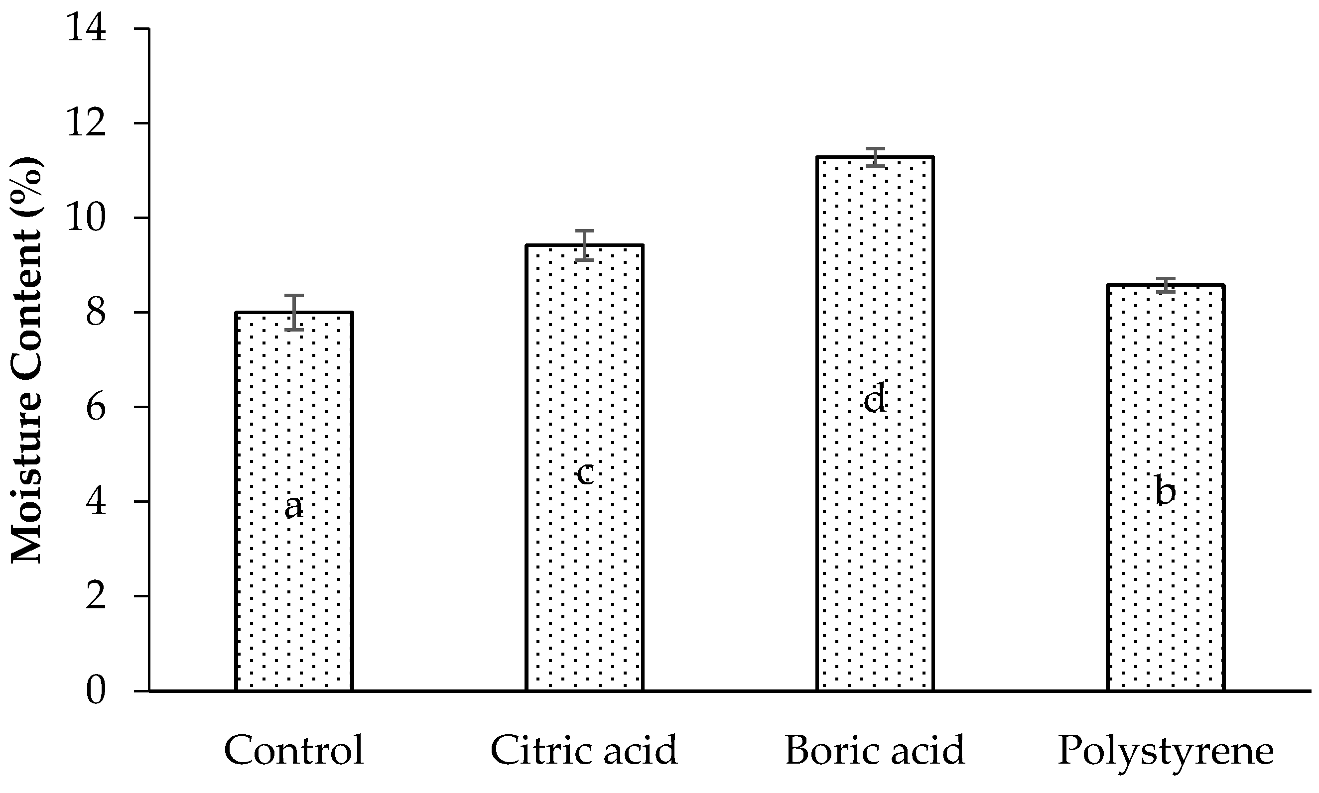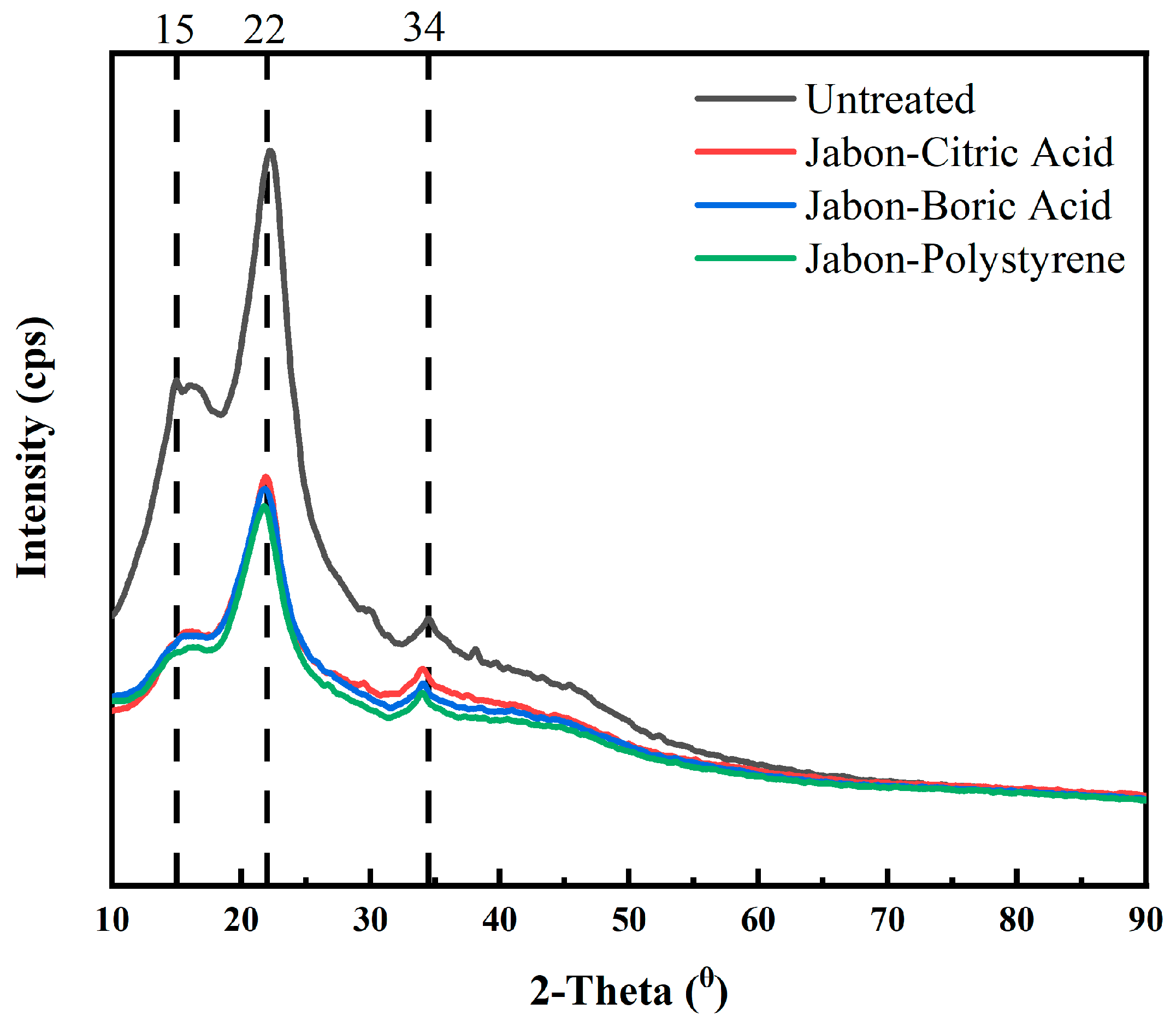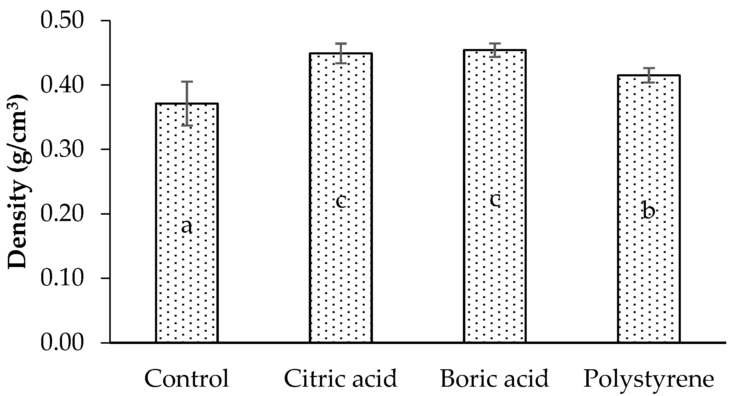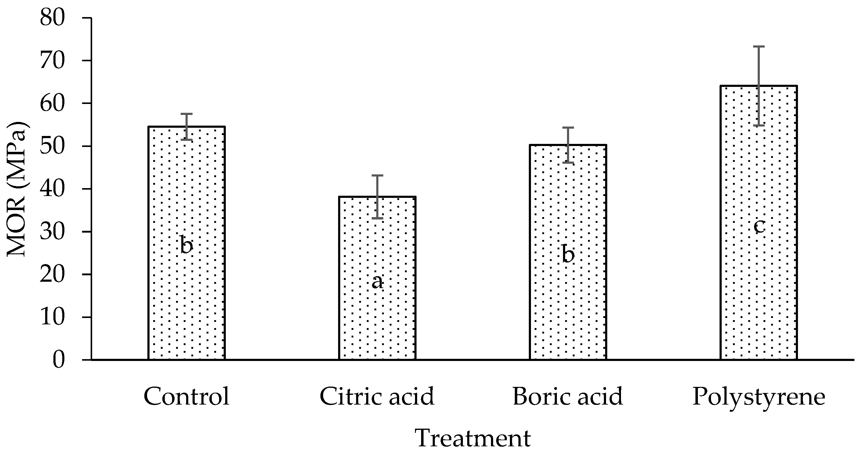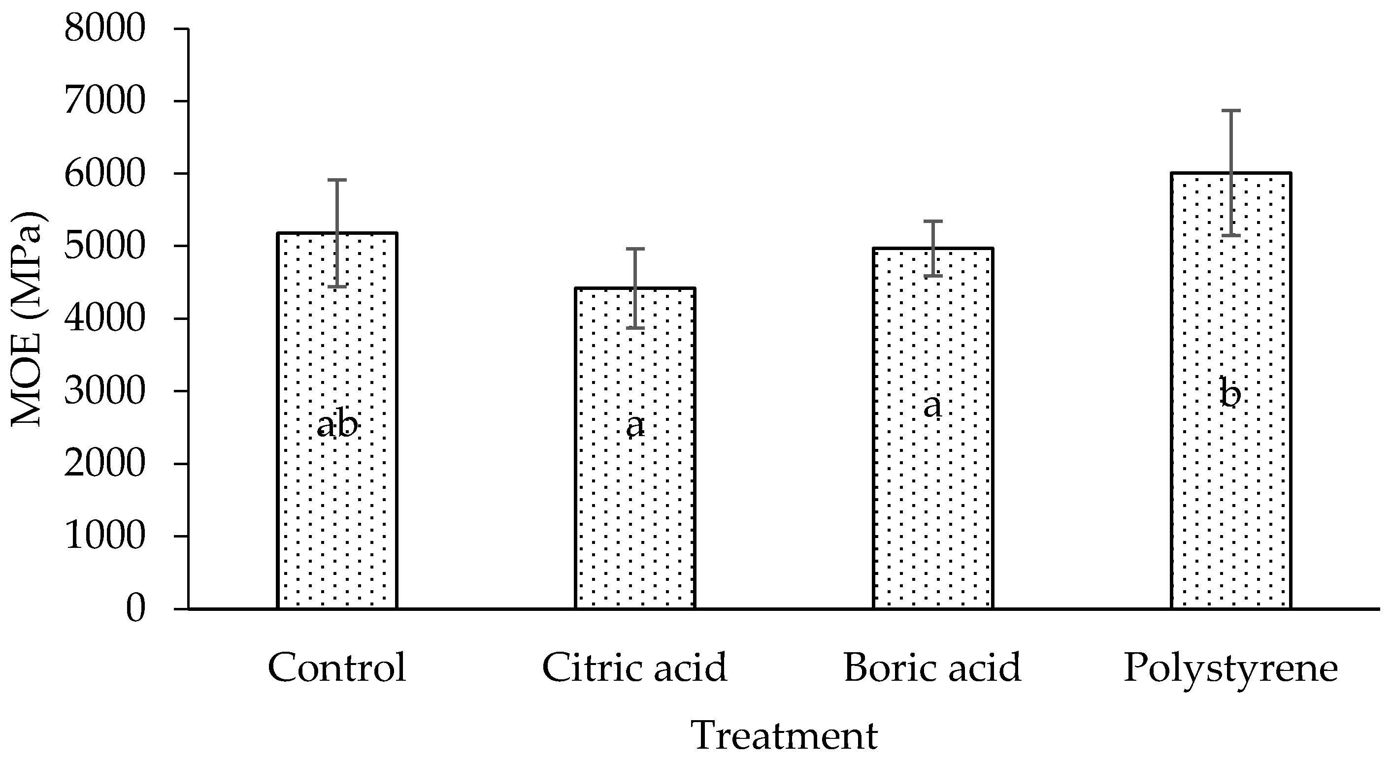 - Hartono, R.; Muliani, P.F.; Sutiawan, J.; Amanda, P.; Sumardi, I.; Rofii, M.N. Properties of Laminated Board from Belangke Bamboo (Gigantochloa Pruriens) Modified with Citric Acid, Boric Acid, and Polystyrene. Wood Mater. Sci. Eng. 2025, 20, 3–10. [Google Scholar] [CrossRef]