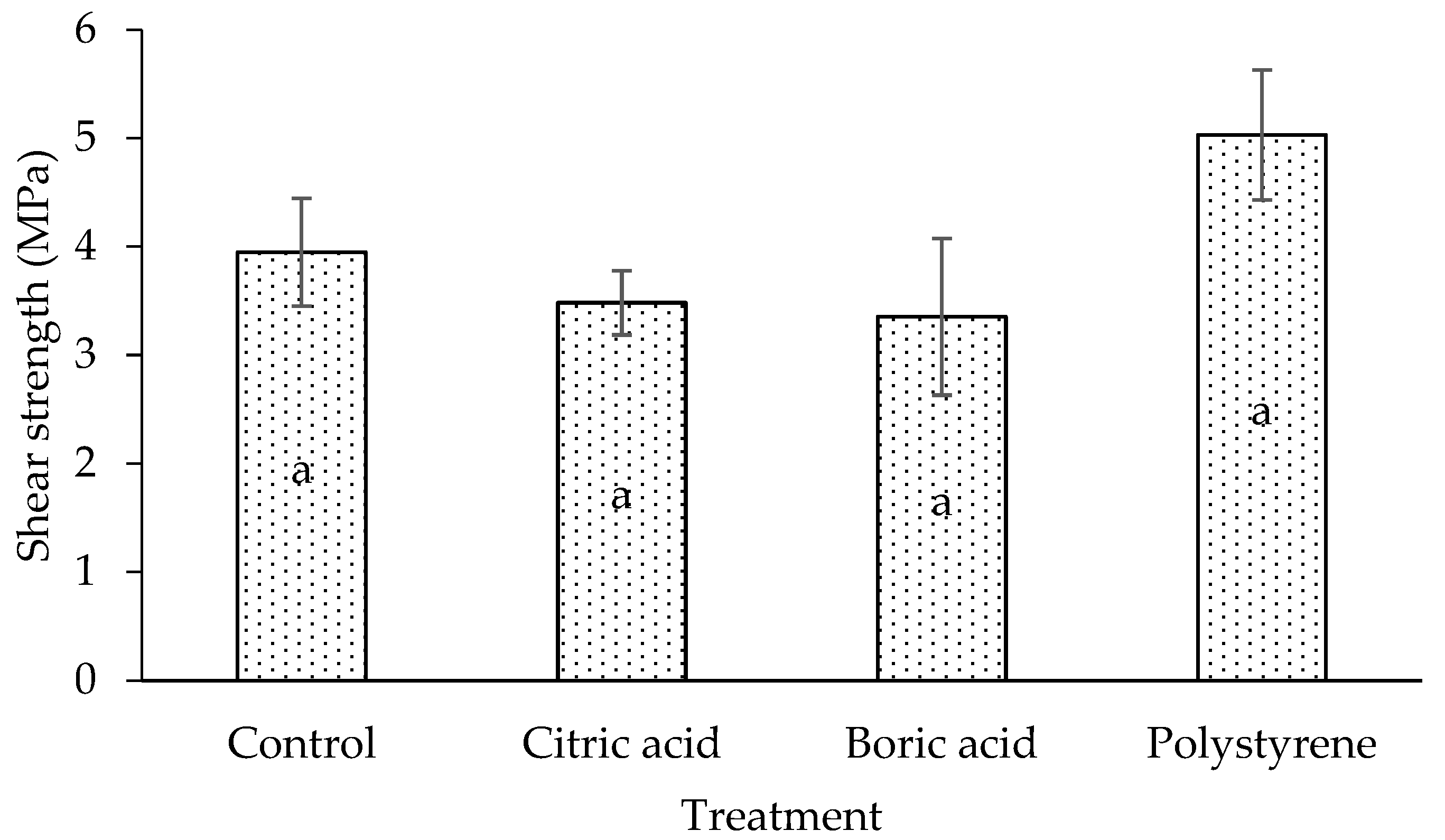 - Nurhanifah; Hermawan, D.; Hadi, Y.S.; Arsyad, W.O.M.; Abdillah, I.B. Shear Strength and Subterranean Termite Resistance of Polystyrene Impregnated Sengon (Falcataria Moluccana) Glulam. IOP Conf. Ser. Mater. Sci. Eng. 2020, 935, 012052. [Google Scholar] [CrossRef]