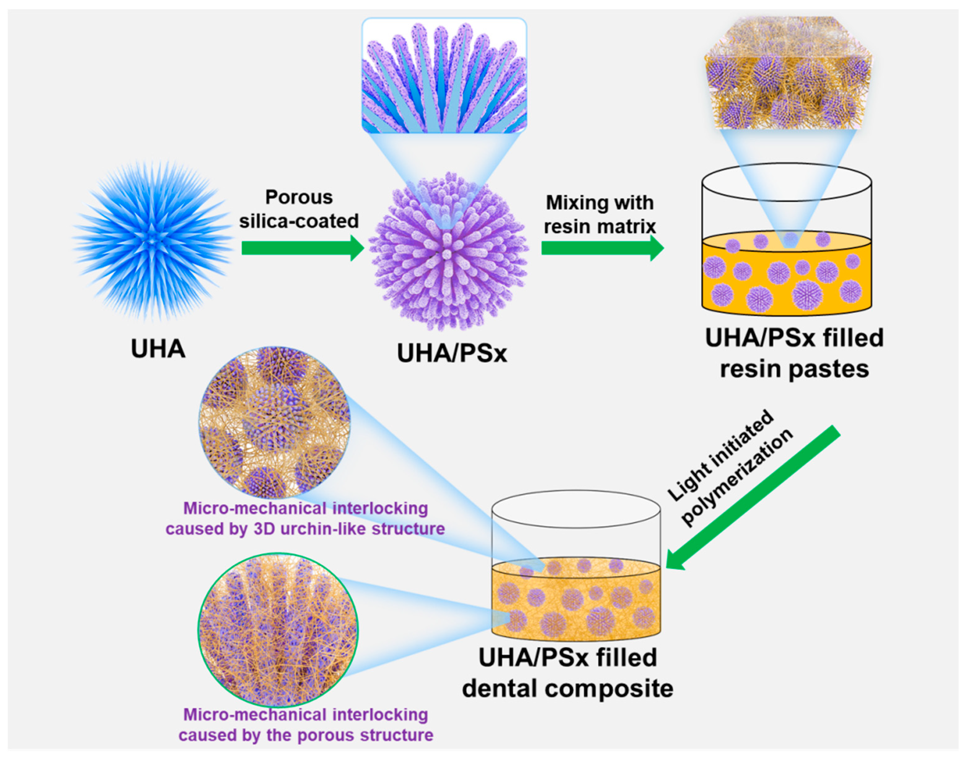 - Qian, L.; Wang, R.L.; Li, W.; Chen, H.Y.; Jiang, X.Z.; Zhu, M.F. The synthesis of urchin-like serried hydroxyapatite (USHA) and its reinforcing effect for dental resin composites. Macromol. Mater. Eng. 2019, 304, 1800738. [Google Scholar] [CrossRef]