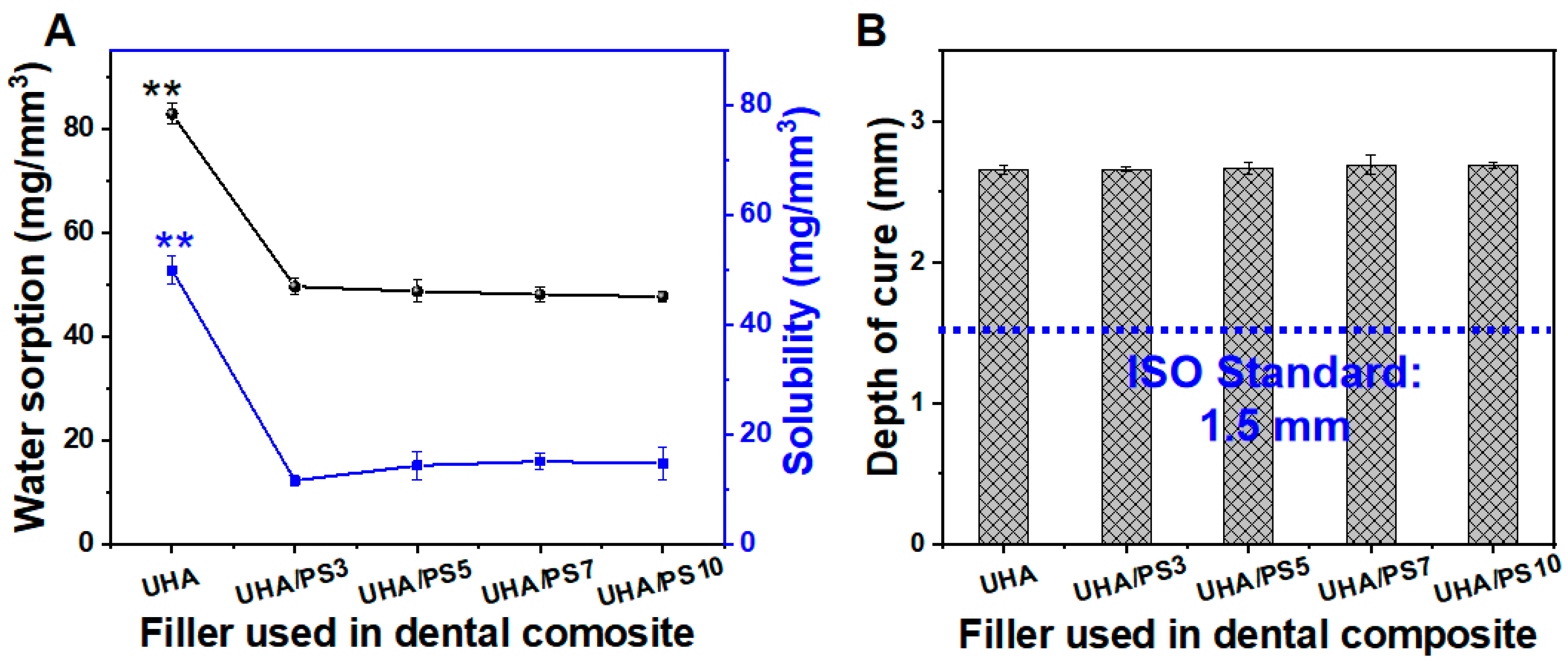 2.4.4. Water Sorption and Solubility of UHA/PSx-Filled DRCs
