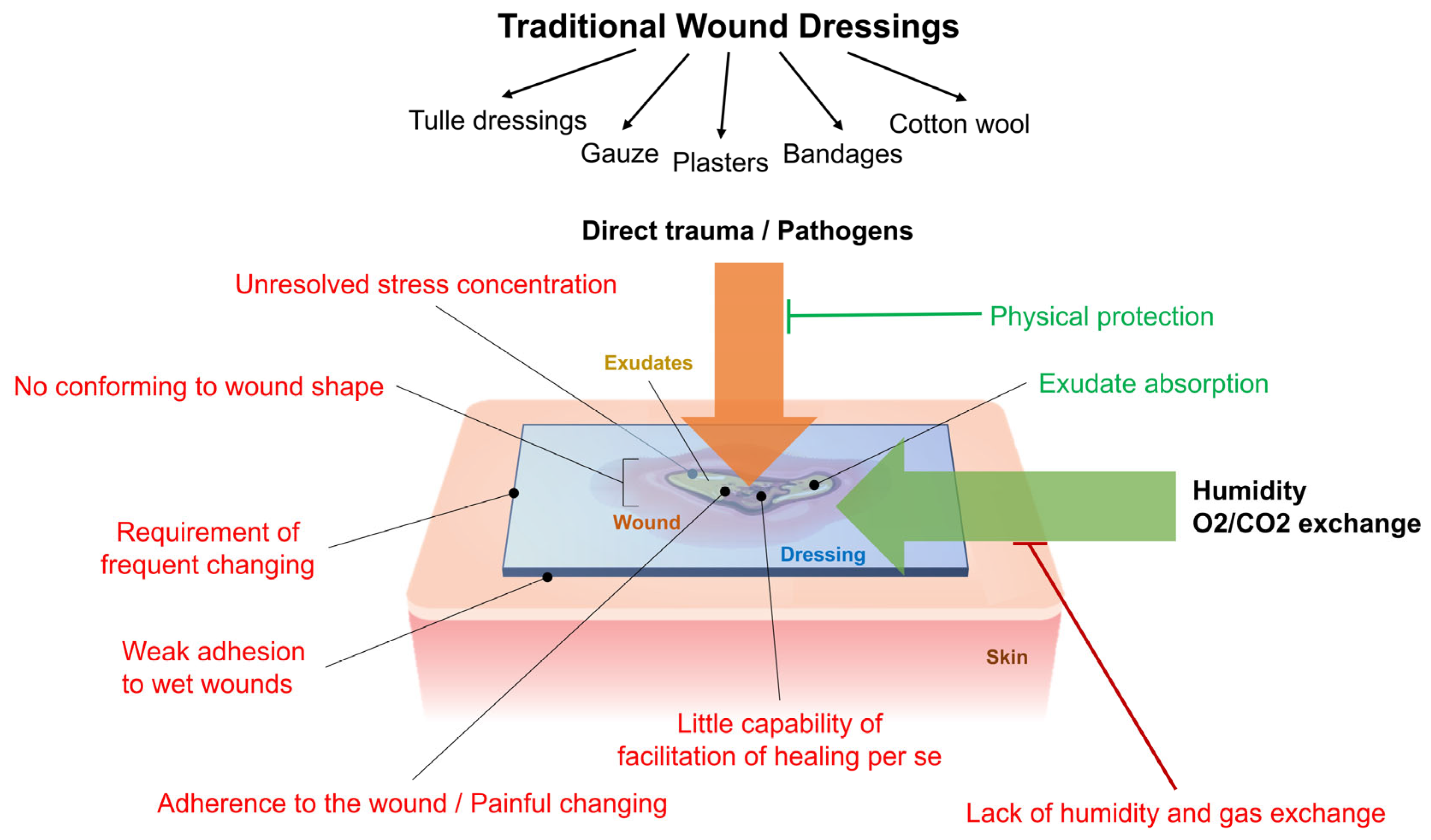 - Özcan Bülbül, E.; Okur, M.E.; Üstündağ Okur, N.; Siafaka, P.I. Chapter 2—Traditional and advanced wound dressings: Physical characterization and desirable properties for wound healing. In Natural Polymers in Wound Healing and Repair; Sah, M.K., Kasoju, N., Mano, J.F., Eds.; Elsevier: Amsterdam, The Netherlands, 2022; pp. 19–50. Available online: https://www.sciencedirect.com/science/article/pii/B9780323905145000201 (accessed on 6 February 2023).