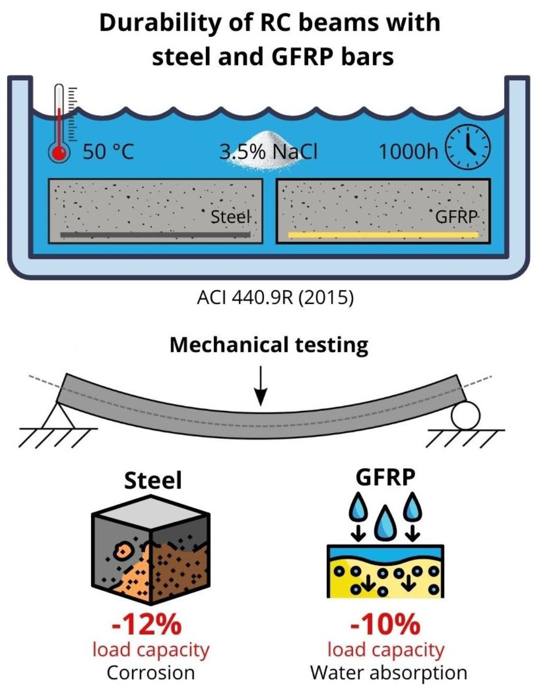 - The exposure of steel-reinforced concrete beams to a chloride solution for 1000 h resulted in a maximum resisted load 12% lower than that observed in steel-reinforced concrete beams subjected to a laboratory environment for the same duration, indicating steel degradation. Concerning GFRP reinforcement, the GFRP-reinforced concrete beams exposed to a chloride solution for 1000 h exhibited a failure force and displacement approximately 10% and 8% lower, respectively, than that GFRP-reinforced concrete beams maintained in a laboratory environment for the same duration, indicating degradation of the GFRP.