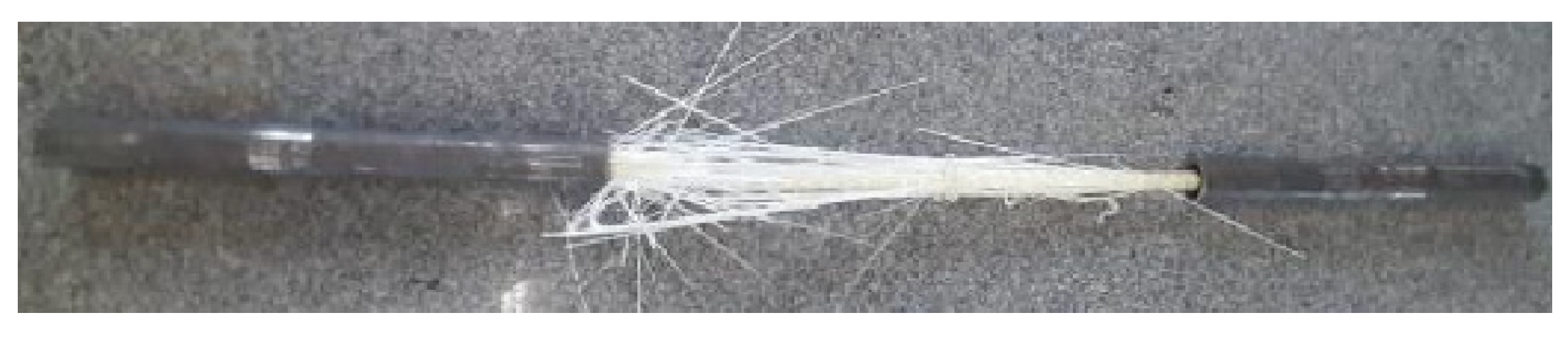 - ABNT NBR 17201-3; Barras de Polímero Reforçado com Fibras (FRP) Destinadas a Armaduras para Estruturas de Concreto Armado—Parte 3: Determinação da Resistência à Tração e do Módulo de Elasticidade. ABNT: Rio de Janeiro, RJ, Brazil, 2025.