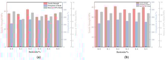 The reinforcement mechanism of bentonite in the polymer film is primarily attributed to the unique nanostructures—either intercalated or exfoliated—formed by montmorillonite within the polymer matrix [31,32,33]. In such structures, the silicate layers of montmorillonite become separated, yielding a high specific surface area and aspect ratio. These dispersed nanosheets effectively transfer stress from the softer polymer matrix to their own rigid layers, significantly restricting the motion of polymer chains and inhibiting the propagation of microcracks. As a result, the tensile strength, modulus, and other mechanical properties of the film are markedly enhanced [34,35].