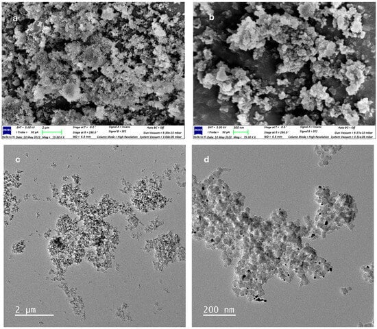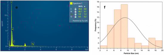 SEM and TEM analysis thoroughly investigated the material’s morphology, structural features, and particle size distribution [59]. The compact and irregular shape of Ag NPs incorporated into Bipy-PAN was observed in the SEM image (Figure 1a,b). Interestingly, the Bipy-PAN capsulation with Ag NPs maintained its original morphology even after the incorporation of nanoparticles. TEM analysis (Figure 1c,d) confirmed a spherical Bipy-PAN structure, with the Ag nanoparticles visible as black dots uniformly distributed across its surface. The average Ag NP diameter was measured at 9.2 nm, a size attributed to the coordination between the Ag nanoparticles and the nitrogen active sites within the Bipy-PAN polymer (Figure 1e,f). Furthermore, the EDX analysis proved the presence of uniformly distributed C, N, and Ag on the sample surface (Figure 1e,f). These findings confirm the effective anchoring of Ag nanoparticles onto the Bipy-PAN polymer matrix, without inducing notable alterations in its morphology [59].