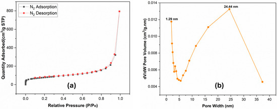 The nitrogen (N2) adsorption at 77 K experiment was used to investigate the porosity of the Bipy-PAN-supported Ag NPs. As shown in Figure 2a, Ag NPs@Bipy-PAN displays a representative type IV adsorption isotherm [60]. The N2 adsorption–desorption isotherms of the Ag NPs@Bipy-PAN manifest a rapid growth of N2 uptake in a low relative pressure range P/P0 < 0.002, demonstrating the existence of a 49.1522 m2/g micropore area. The presence of mesopores is evidenced by the hysteresis loop that accompanies the desorption curve. The total pore volumes were calculated at P/P0 = 0.99 and found to be 1.21 cm3/g. Ag NPs@Bipy-PAN’s BET specific surface area was calculated to be ~279 m2/g, while Bipy-PAN specific surface areas were ~161 m2/g [58]. This indicates that the (BET) specific surface areas were improved because of ultrafine Ag NP loading inside the pores of Bipy-PAN [27,61]. The ultrafine Ag NPs possess a greater surface-to-volume ratio, which results in Ag NPs@Bipy-PAN having an increased surface area due to a higher number of active surface sites. Furthermore, the BJH model is applied to estimate how pore sizes are distributed in Ag NPs@Bipy-PAN. As shown in Figure 2b, the BJH model of Ag NPs@Bipy-PAN indicates a predominate presence of micropores and mesopores, with pore sizes centered at approximately 1.29 nm and 24.44 nm, respectively.