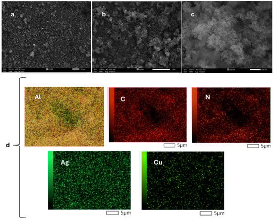 Moreover, Cu (II) adsorption on Ag NPs@Bipy-PAN was confirmed through SEM and EDX analysis. SEM was utilized to visualize the morphology of Ag NPs@Bipy-PAN after adsorbing Cu (II). The captured micrographs revealed a layered and porous structure at different magnifications. Notably, SEM demonstrated that the morphology of Ag NPs@Bipy-PAN remained intact even after copper ion adsorption (Figure 3a–c). Furthermore, EDX elemental mapping confirmed the presence of C, N, and Ag elements, as well as the effective dispersion of Cu (II) within Ag NPs@Bipy-PAN (Figure 3d). The findings from the study indicated that Ag NPs@Bipy-PAN exhibited a remarkable adsorption capacity for Cu (II).