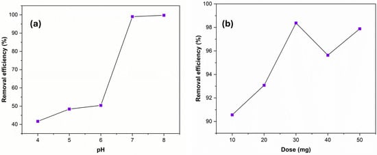 Studying the effect of pH of the aqueous solution is an important investigation that significantly impacts the adsorption process of an adsorbent. Moreover, the pH of the solution may affect the degree of ionization, speciation of the adsorbent, the surface charge of the adsorbents, and metallic ion hydro-complexes. The pH value of the mixture solution was adjusted from 4 to 8 by using HCl or NaOH. Figure 4a shows the strong effect of pH solution on the removal efficiency of Cu (II) due to the competition between H+ and OH− ions and Cu (II) ions on the active sites of the sorbent polymer in acidic or basic solutions. In the acidic media, the active nitrogen sites were deactivated with protons; therefore, the removal efficiency of Cu (II) is ineffective at an acidic pH value. Additionally, at a pH higher than 7, the precipitation of Cu (II) ions as Cu(OH)2 can be motivated, which is not favorable. As a result, pH 7 was applied in further adsorption experiments.