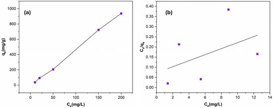 where is the concentration at equilibrium of Cu (II) in the solution represented in mg/L, is the Cu (II) uptake by the adsorbent at equilibrium concentration (mg/g), is the uptake capacity of the adsorbent expressed in (mg/g), and b represents the Langmuir constant (L/mg). On the other hand, the Freundlich model (Equation (4)) describes the adsorption of Cu (II) over a reversible heterogeneous surface of the adsorbent, where the process is not limited to monolayer adsorption [67]: