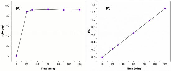 The kinetics behavior of the adsorbent was studied using 20 ppm of Cu (II) and 30 mg of Ag NPs@Bipy-PAN at the optimum pH by collecting samples at periods of 20, 30, 60, 90, and 120 min. As it appears in Figure 6a, the adsorption equilibrium has been achieved in the first 20 min, which indicates the rapid Cu (II) adsorption efficiency by Ag NPs@Bipy-PAN. The observed experimental values were fitted to kinetic models based on the pseudo-first order (PFO, (Equation (5)) and pseudo-second order (PSO, Equation (6)) models, and the corresponding parameters are summarized in Table 5 [71].