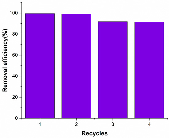The economic aspects of regenerating the adsorbent and its ability to be reused for metal adsorption have great importance. Figure 7 shows the recycling process of Cu (II) adsorption on Ag NPs@Bipy-PAN. It was found that the regeneration process was repeated four times consecutively and the removal efficiency was 99.5% in the first cycle and decreased to 99.1% in the second cycle. Although there was a slight decrease in recycling efficiency during the third cycle, this eventually stabilized. These findings emphasize the significant potential of Ag NPs@Bipy-PAN as an economically viable adsorbent for removing Cu (II) ions, demonstrating remarkable regeneration performance. Consequently, it is highly recommended for water treatment applications. Although a modest decline in performance was observed over four cycles, the chelating Ag–bipyridine interface is expected to limit Ag loss; future optimization—via higher ligand density/crosslinking, pH control, and optional protective interlayers—will be pursued to further suppress leaching and distinguish fouling from true Ag loss.