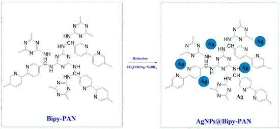 Ag NPs were encapsulated by Bipy-PAN as described previously [59]. A total of 170 mg of Bipy-PAN was dispersed in 40 mL of deionized water as a hydrophilic solvent, and the solution was sonicated for 1 h until achieving homogeneity. Following 30 min of stirring, a solution of CH3COOAg (0.02 mmol) dissolved in CH2Cl2 (0.04 mL) as the hydrophobic solvent was slowly added dropwise over 10 min with continuous vigorous stirring. The mixture was continuously stirred for five hours as a result. The prepared mixture was then reduced by the addition of 1 mL of a high-concentration aqueous solution of NaBH4 (2.7 M). The mixture was eventually filtered, washed with deionized water, and dried at 70 °C for two hours to produce the solid sample, as shown in Scheme 1.