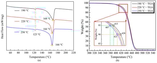 To ensure the credibility of the results, three different samples were fabricated through the thermo-compression molding technology with three different temperatures (190 °C, 220 °C, 250 °C). Figure 1a,b illustrate the heat flow/temperature curves obtained from the DSC tests and weight/temperature curves from the TGA tests, respectively. It can be found that the ultimate melting temperature of the PP matrix was about 166 °C, as shown in Figure 1a. Meanwhile, the thermogravimetric data in Figure 1b indicate thermal decomposition onset near 400 °C, and the decomposition temperature of the PP matrix ranged between 450 °C and 480 °C, in which the sample lost the vast majority of weight.