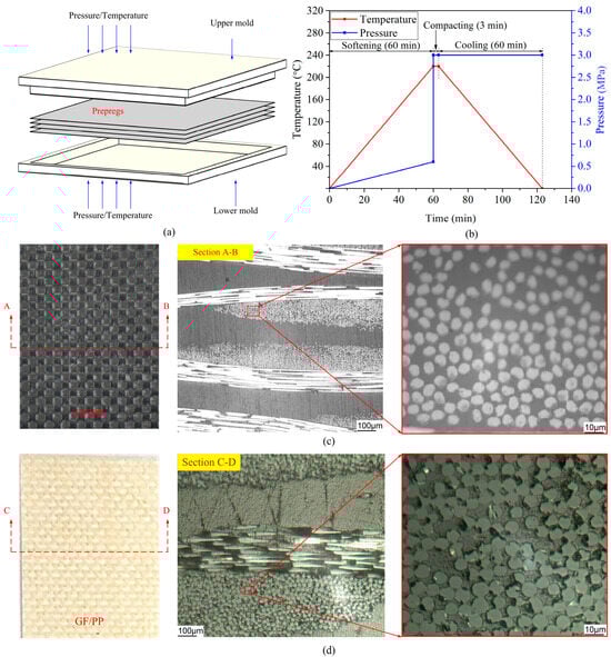 Thermo-compression molding process: (a) schematic diagram of the thermo-compression molds; (b) process curves; (c) macro-/micromorphologies of CF/PP; (d) macro-/micromorphologies of GF/PP.