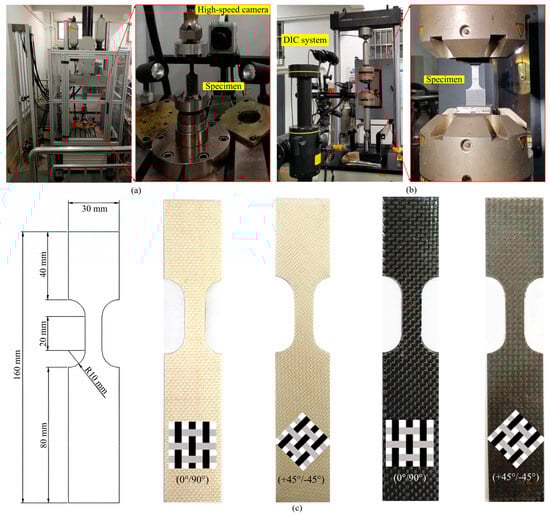 To capture deformation modes and strain evolution during dynamic tensile tests, a high-speed camera integrated with digital image correlation (DIC) was employed for non-contact strain measurement. All dynamic tests were conducted using the high-speed tensile machine (HTM 5020, ZwickRoell, Ulm, Germany), which offers a velocity range from 0.01 m/s to 20 m/s, as illustrated in Figure 3a. Since the lowest velocity of the machine is limited to 0.01 m/s, quasi-static tests with velocity of 2 mm/min (strain rate of 1.7 × 10−6 s−1) were conducted at the static tensile machine (8801, Instron, Norwood, MA, USA), and the DIC system was also employed to capture the strain evolution and failure behaviors of specimens, as shown in Figure 3b. Figure 3c shows the CF/PP and GF/PP specimens subjected to uniaxial tension and bias extension tests.