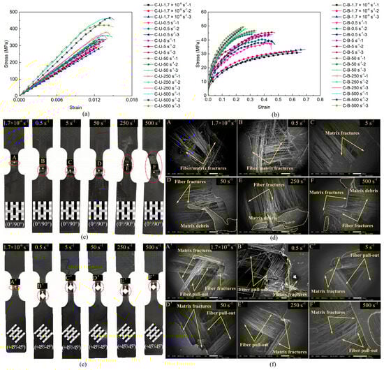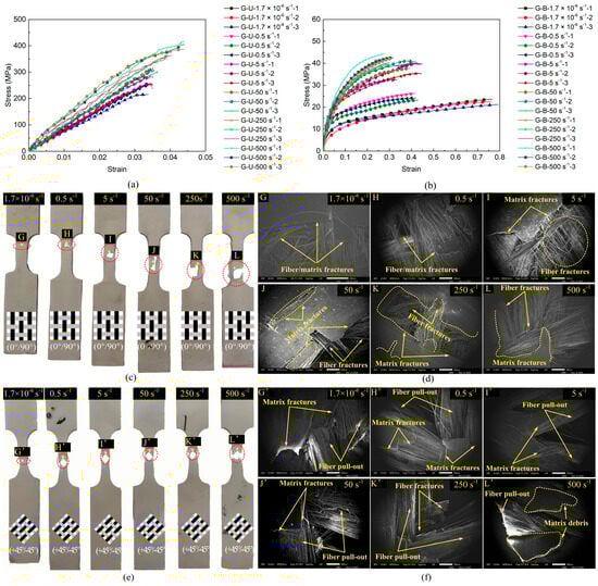 Figure 4 and Figure 5 comparatively illustrate the mechanical responses, stress–strain curves, and failure modes of the CF/PP and GF/PP specimens across six strain rates (1.7 × 10−6 s−1~500 s−1), respectively. Table A1 and Table A2 summarize the modulus, strength, and failure strain parameters of all the CF/PP and GF/PP specimens (see Appendix A). In uniaxial tension testing of the CF/PP and GF/PP specimens, the stress–strain responses across six distinct strain rates exhibited linear elastic behaviors. The failure strain of the CF/PP specimens remained relatively constant at all strain rates. In contrast, the GF/PP specimens exhibited a marked increase in failure strain when the strain rate exceeded 250 s−1, as illustrated in Figure 4a and Figure 5a. During bias extension testing, the shear stress–strain curves for both the CF/PP and the GF/PP specimens revealed pronounced nonlinear deformation characteristics across six strain rates. Notably, the shear failure strain for both the CF/PP and the GF/PP specimens decreased as the strain rate increased, as depicted in Figure 4b and Figure 5b.