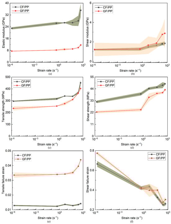 Based on the uniaxial tension and bias extension stress–strain curves of the CF/PP and GF/PP specimens (Figure 4a,b and Figure 5a,b), the elastic/shear modulus, tensile/shear strength, and tensile/shear failure strain parameters were derived and summarized in Table A1 and Table A2 (see Appendix A). Since each test condition was repeated three times, the average value of these replicates is reported as the ultimate mechanical parameter. The standard deviation () calculated using Equation (A1) provided in Appendix A was used to quantify the variability of the experimental data. Figure 6 compares the difference in modulus, strength, and failure strain parameters between the CF/PP and GF/PP specimens across six strain rates, with error bands indicating the standard deviation. Figure 6a,d indicate that both the modulus and strength parameters of the CF/PP and GF/PP specimens demonstrated a progressive increase corresponding to the rise in strain rates. Specifically, the tensile/shear modulus and tensile/shear strength of the CF/PP specimens at a strain rate of 500 s−1 increased by 53.08%/53.6% and 52.5%/52.4% compared to those measured at 1.7 × 10−6 s−1, respectively. Similarly, the tensile/shear modulus and tensile/shear strength of the GF/PP specimens at a strain rate of 500 s−1 increased by 54.6%/113.4% and 71.5%/92.3% compared to those measured at a strain rate of 1.7 × 10−6 s−1, respectively. It is important to highlight that the modulus and strength values of CF/PP consistently exceed those of GF/PP under identical strain rate conditions. This difference is attributable to the superior stiffness and strength characteristics of carbon fibers.