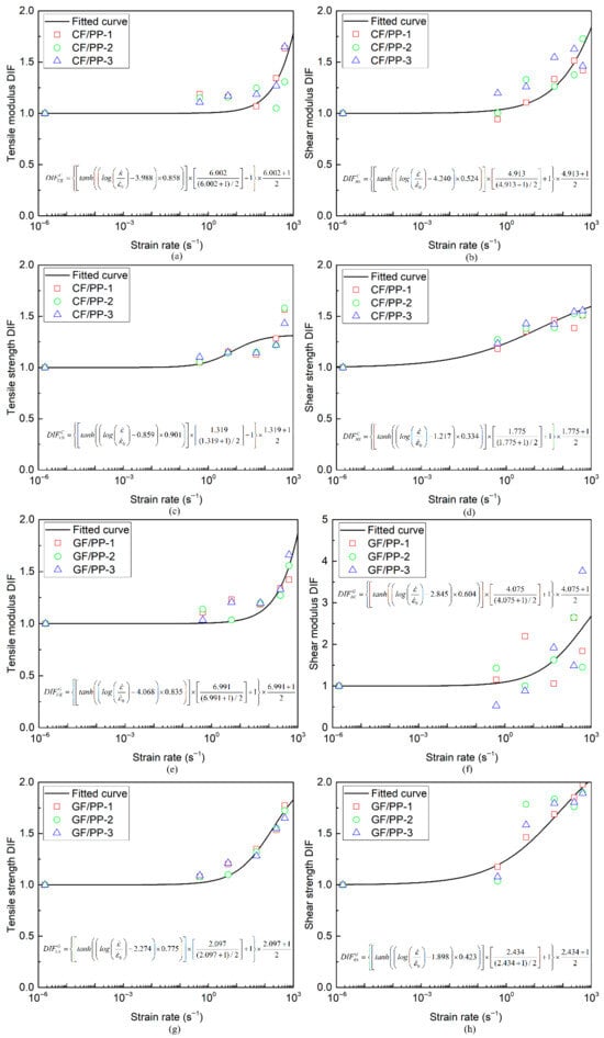 value–strain rate curves of CF/PP and GF/PP specimens: (a) tensile modulus of CF/PP; (b) shear modulus of CF/PP; (c) tensile strength of CF/PP; (d) shear strength of CF/PP; (e) tensile modulus of GF/PP; (f) shear modulus of GF/PP; (g) tensile strength of GF/PP; (h) shear strength of GF/PP.