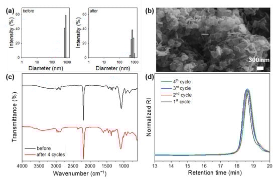 Results of the recycling experiment of HDMC catalyst: (a) particle size distributions before and after four cycles. (b) SEM image obtained after four cycles. (c) FTIR spectra collected before and after four cycles. (d) GPC curves of the resultant polyols.