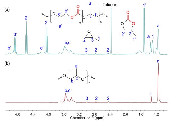 1H NMR (400 MHz, CDCl3) spectra of the crude reaction mixture of the ROCOP of CO2 with PO (a) and ROP of PO (b) using HDMC catalyst.