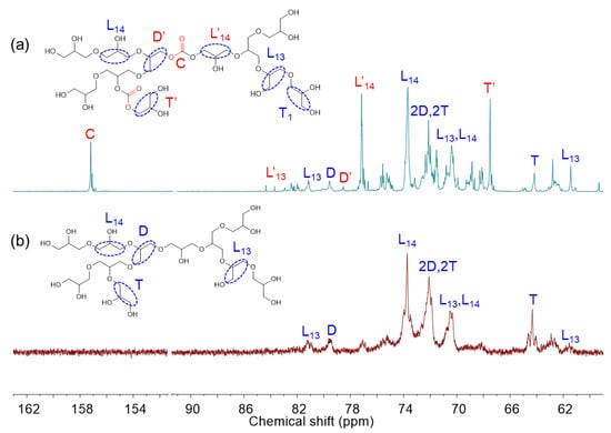 13C NMR (400 MHz, CDCl3) spectra of the poly(glycidol carbonate) (a) and polyglycidol (b) using HDMC catalyst. L, T, D, C denote linear, terminal, dendritic, and carbonate components, respectively.