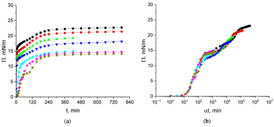 It is noteworthy that despite the fact that the master curves for different plant protein solutions have some common features, they differ from one another and thereby are individual characteristics of the protein for a given solvent. The shapes of the master curves are approximately the same only at low surface pressures when a rather fast increase in the surface pressure occurs after a short induction period (usually 5–100 min) corresponding to almost zero surface pressures [16,17,25,30,37].