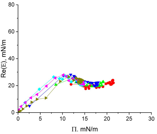 Another master curve appears if the real part of the dilational dynamic surface elasticity or the surface elasticity modulus are plotted as a function of the surface pressure (Figure 3, Figure 6 and Figure 8). In this case, the experimental data for different concentrations fall on a single curve. This master curve is also an individual characteristic of a substance for a given solvent. Its shape reflects the organization of the adsorption layer and thereby the properties of macromolecules.