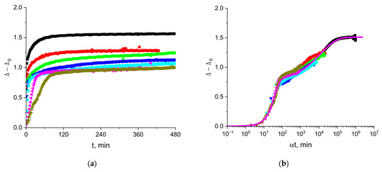 The kinetic dependencies in Figure 2a collapse into a single master curve (Figure 2b), with a shift factor α depending on the concentration (Figure S2a). The master curve analysis has been applied only recently to the adsorption kinetics of proteins [16,17,25,37]. This approach consists of the shifting of all the kinetic curves to a single reference curve, thereby excluding the concentration as an additional variable. The time–concentration superposition assumes a mathematical equivalence between the time and concentration effects, allowing a kinetic curve for a reference concentration to be reconstructed from other concentrations using the shift factors :
