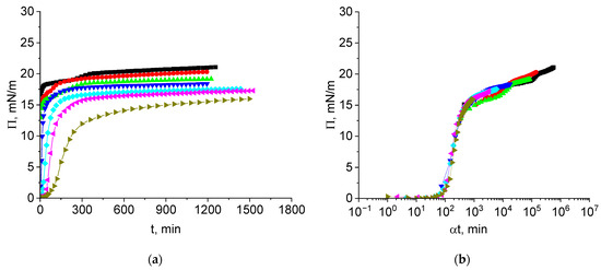 At low surface pressures, the shift factor is usually a quadratic function of the concentration in agreement with the diffusion-controlled adsorption mechanism [16,25]. Another argument in favor of this mechanism is the square root dependence of the surface pressure on the surface age (Figure S6). This feature is in agreement with the Ward–Tordai equation for small surface concentrations [42].