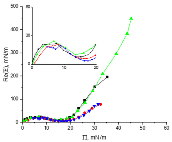 Note that the non-monotonic dependencies of the dilational surface elasticity on surface pressure were also observed for dispersions of polymer microgels if a relatively hard core of microparticles is surrounded by a soft corona, which is formed by a flexible chain [48,49,50]. In this case, the dependencies of the surface elasticity on surface pressure for microgel dispersions can be very close to those for solutions of amphiphilic macromolecules [48].
