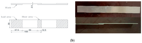 Figure 1 presents the geometry and configuration of the specimens used for the mechanical property tests of the epoxy resin binder. The tensile property test, conducted in accordance with ASTM D638-10 [24], utilized dog-bone-shaped specimens (Figure 1a). The shear property test followed the Chinese national standard GB/T 7124-2008 [25], and used specimens formed by bonding two aluminum sheets (Figure 1b). To ensure concentric loading and uniform stress distribution, uniform-thickness gaskets were placed at both ends of each specimen.