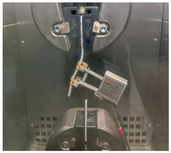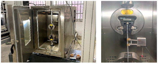 Quasi-static tensile tests were carried out using an MTS Landmark-370.25 (MTS Systems, Eden Prairie, MN, USA) electro-hydraulic servo testing system equipped with an MTS high/low-temperature chamber, as shown in Figure 2. Pneumatic fixtures were employed for clamping, with the lower chuck fixed and the upper chuck moving vertically. The temperature chamber provided a control range from −100 to 300 °C and maintained a temperature accuracy of ±0.5 °C. Displacement-controlled loading was adopted, with a tensile test rate of 2 mm/min and a shear test rate of 0.3 mm/min. The upper end of the specimen was first clamped, and the ambient temperature was set prior to testing. Once the chamber temperature reached approximately 3 °C below the target value, the chamber was opened to clamp the lower end of the specimen, then closed to resume heating. After reaching the specified temperature, the chamber was maintained at that temperature for 15 min before testing commenced. Throughout the test, temperature, load, and displacement were continuously recorded by sensors integrated into the loading system. The maximum load at each temperature was recorded as the failure load, and the cross-sectional dimensions of the failed specimen were measured using an electronic vernier caliper.