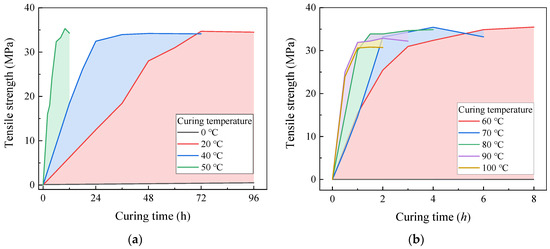 Effect of curing temperature on tensile strength of epoxy resin. (Reproduced with permission from [26]. Copyright 2025, Acta Materiae Compositae Sinica). (a) Tensile strength at 0–50 °C; (b) tensile strength at 60–100 °C.